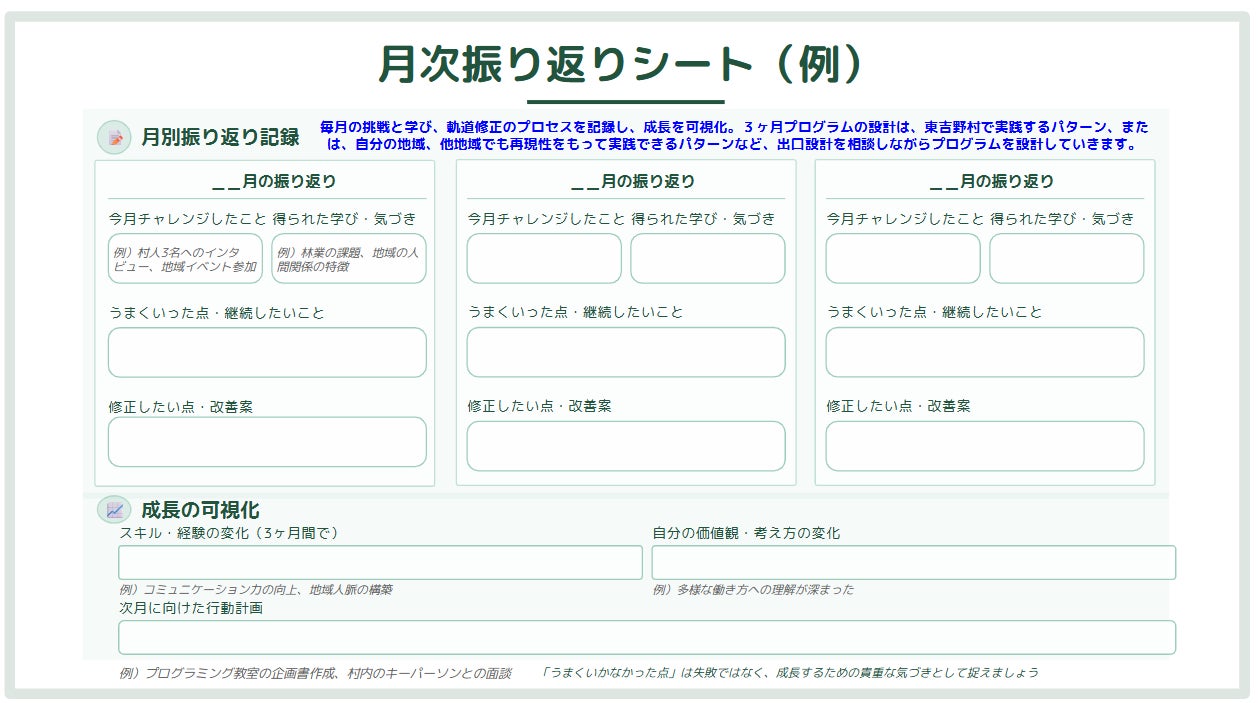 開催前にテーマを定め、開催中は現地体験を通じて解像度を高め、開催後は実行計画へ落とし込むことで、自分に合った「地域複業=持続可能なキャリアデザイン」を具体化します。