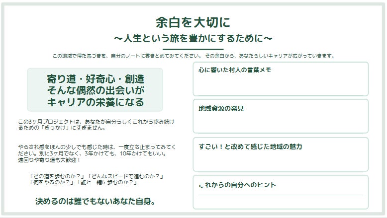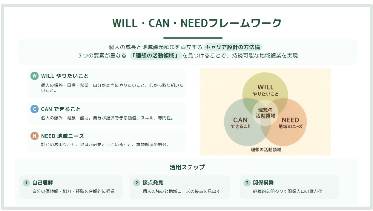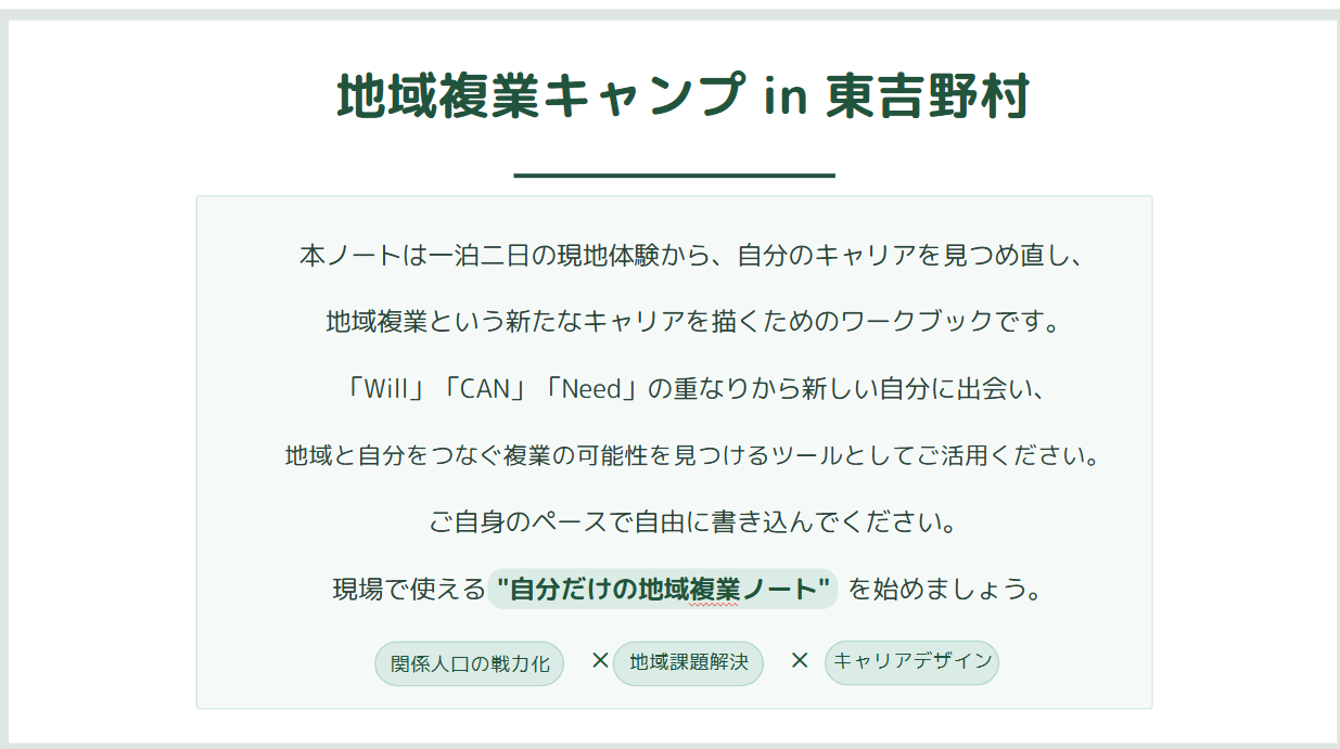 旅×キャリアの専門家「旅する人事」監修の地域複業ノートを用い、参加者それぞれの WILL(やりたい)/CAN(できる)/NEED(地域から求められる) を整理し、言語化・可視化するプログラムです。開催前後に、個別メンタリングの時間も設けられており、参加者ひとりひとりの個別性を重視したキャリアプログラム設計となっています。