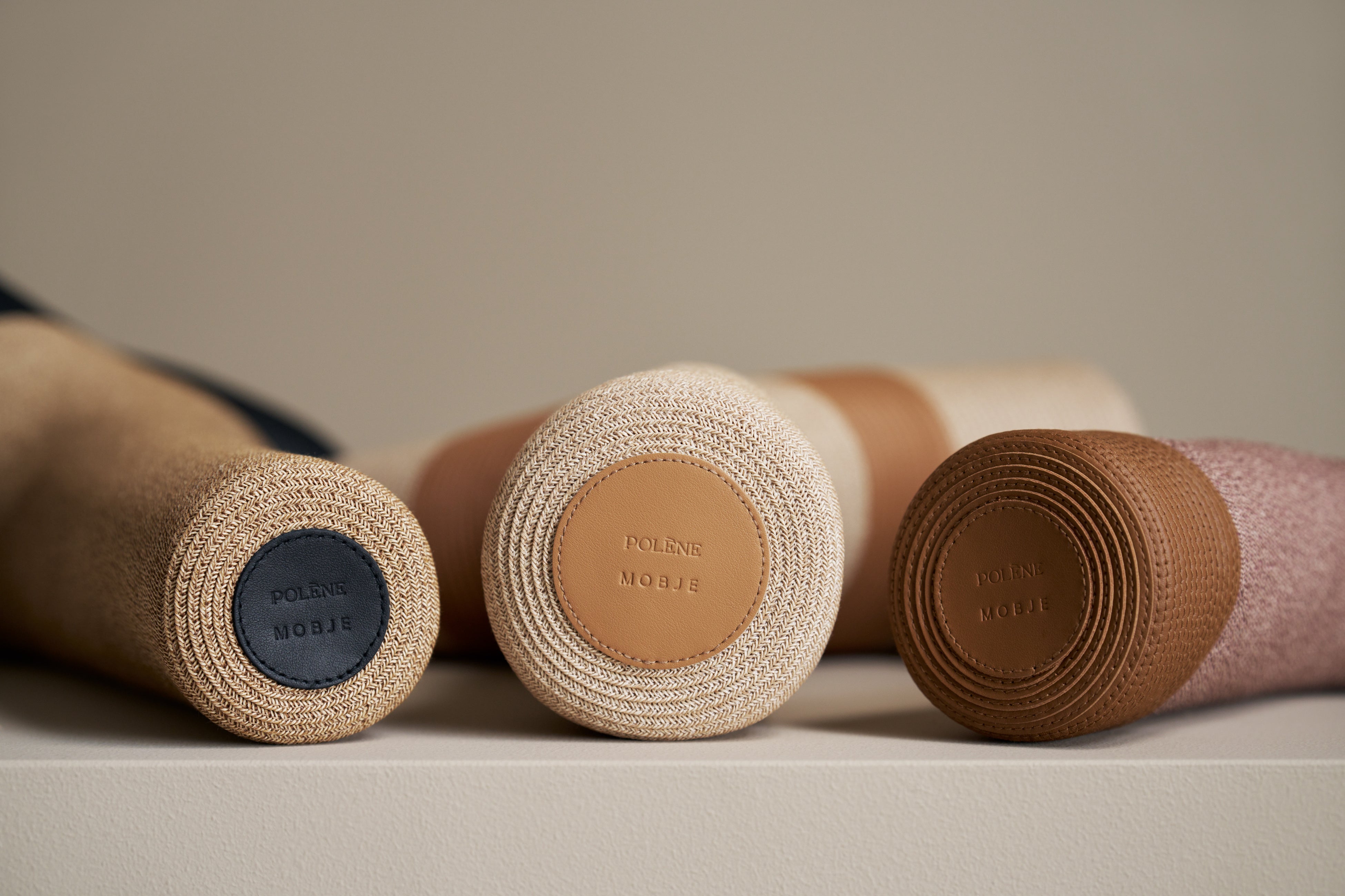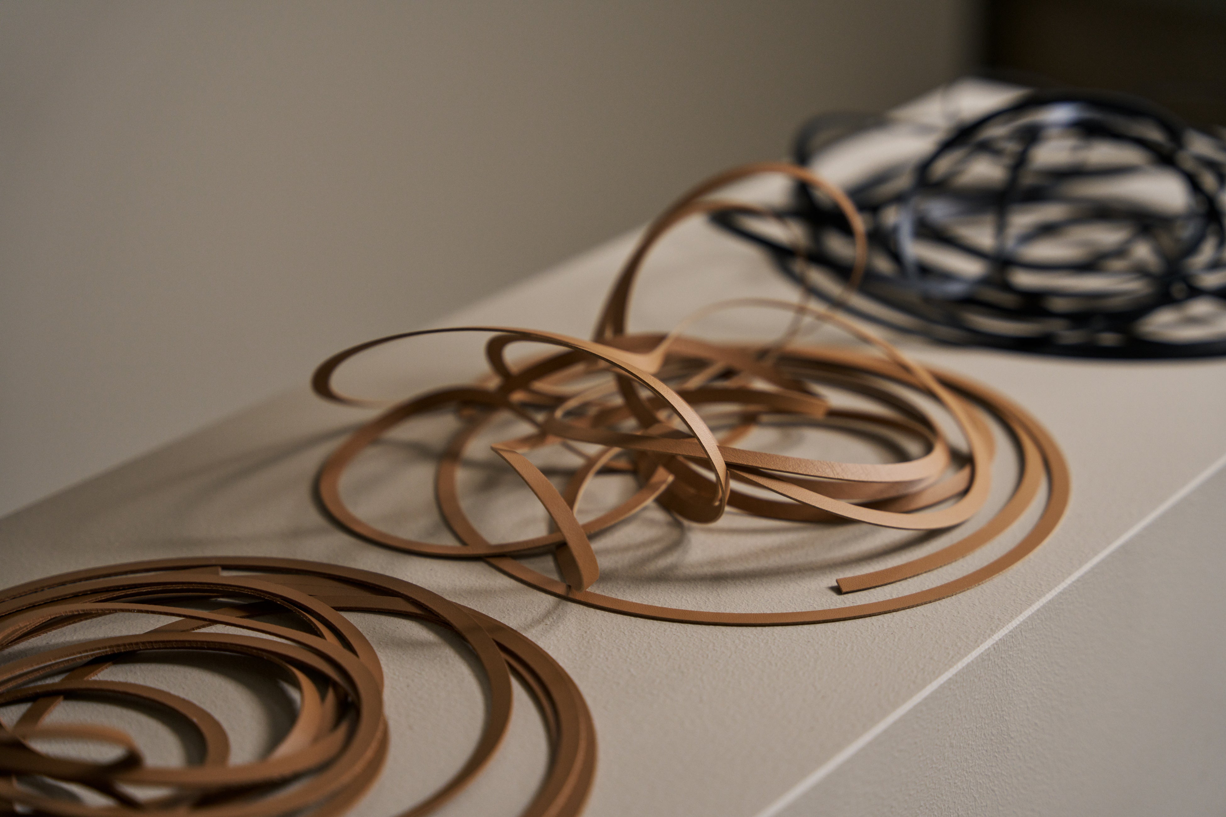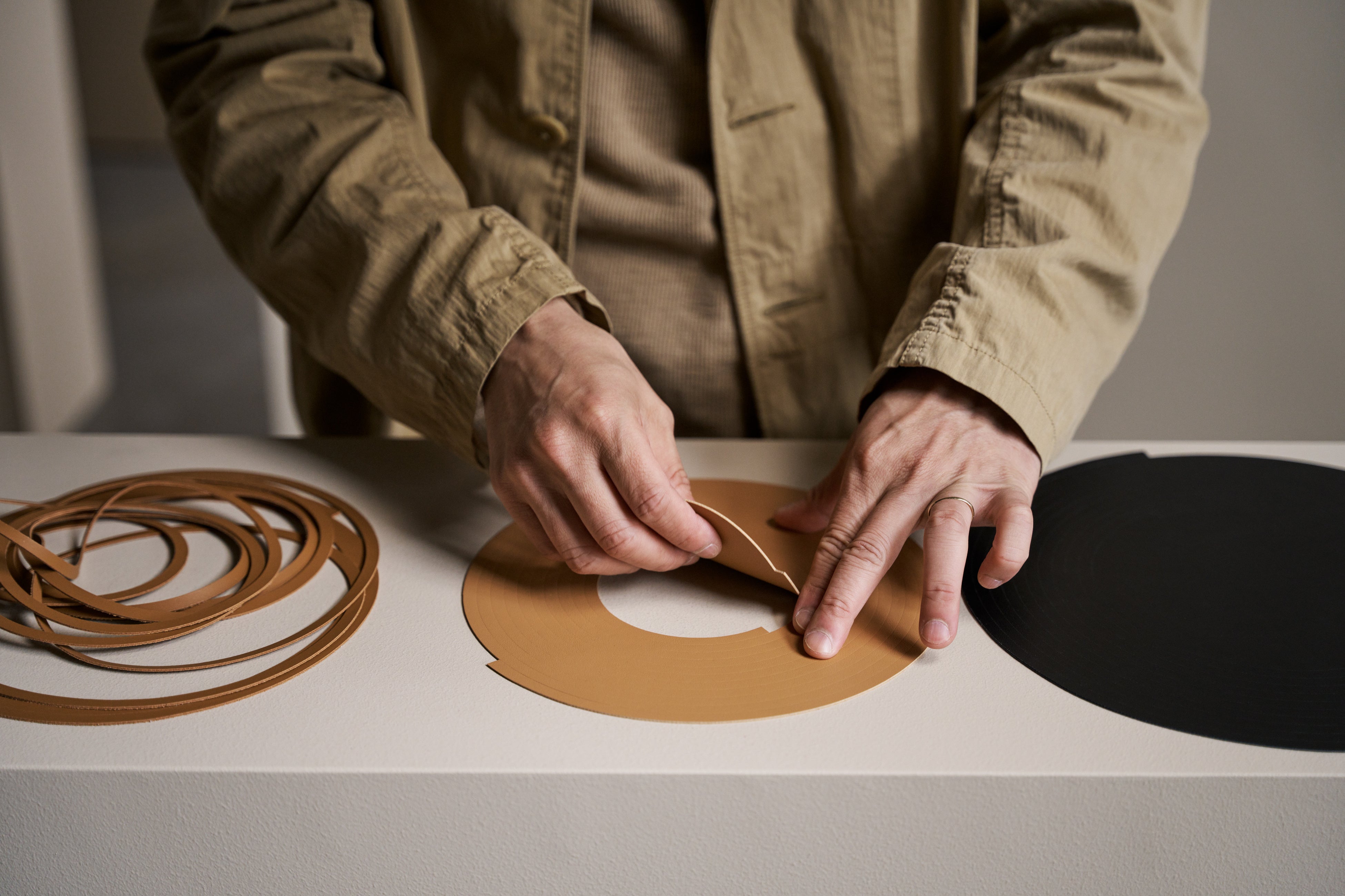 今回のコラボレーションは、革製品の製作過程で出る本来であれば破棄する革の端材をクリエイションに生かす、アップサイクリングへの取り組みの一環として実現された。螺旋状にカットされた、サイズや形が異なる革の端切れは、「MOBJE」の紙の繊維によって織られたブレードに丁寧に縫い込まれてつくられている。