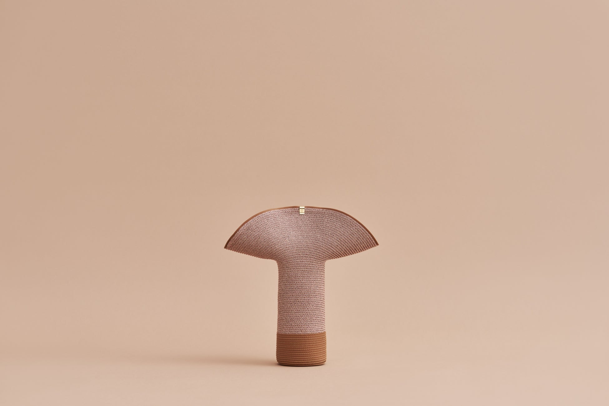 淡いピンクボディに組み合わされた、キャメルのスムースレザーが花瓶の底を飾ると共にエッジを強調。