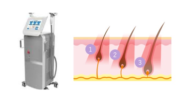 は痛みが少ない新蓄熱式ダイオード医療脱毛機です。様々な体毛に効果的な3波長同時照射が可能です。敏感肌や日焼け肌、スキントーンが暗い方など、今までの機器で脱毛を諦めていた方も脱毛可能です。発毛の司令塔「バルジ領域」に熱刺激を与えることにより、新たな毛の再生を抑えます。