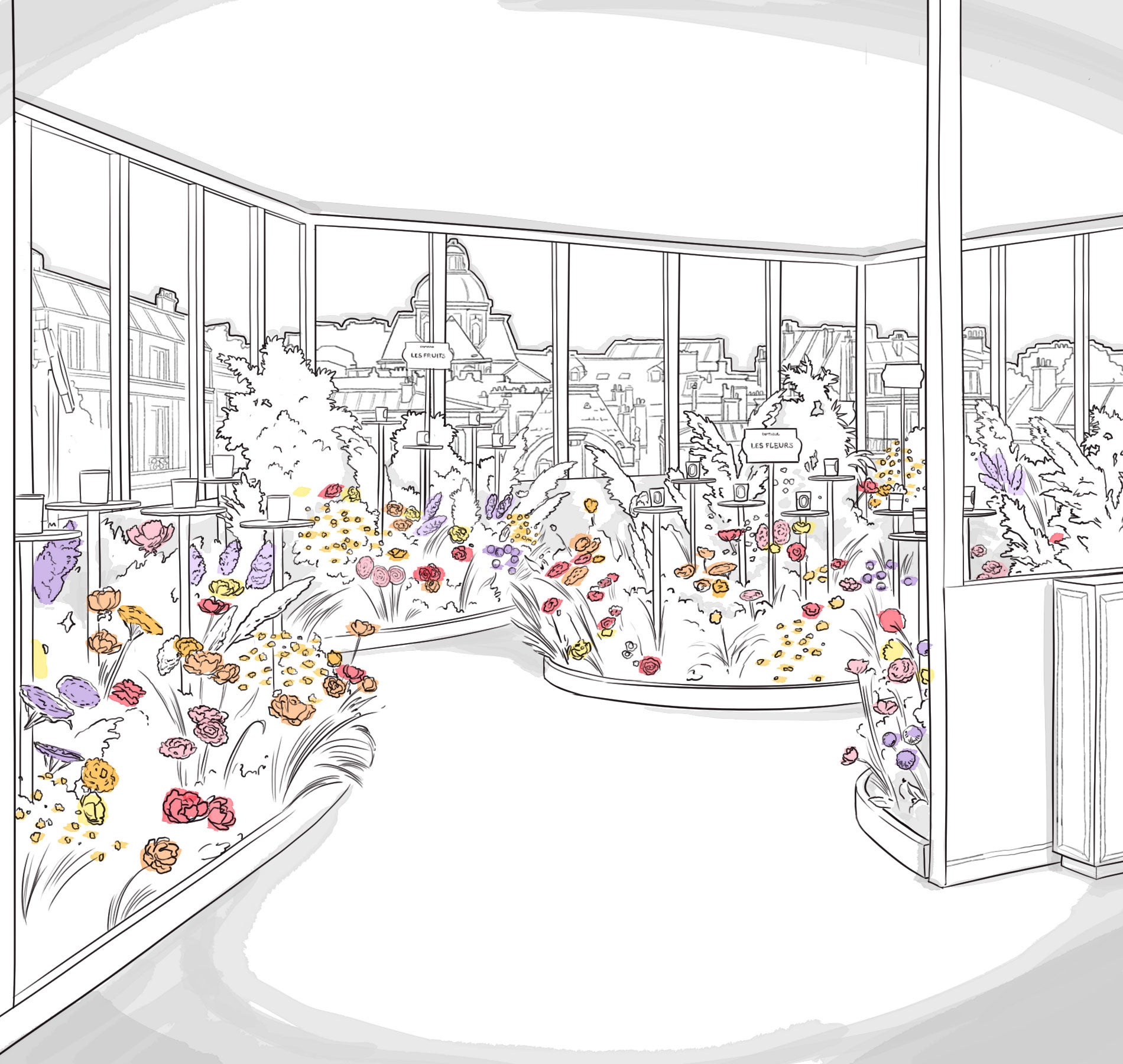 オスマン建築の屋根と雲の間にある空想の道、メゾンのインスピレーションやサヴォアフェール(職人技)の源へと通じる、グラフィカルで夢のように美しい散策へと誘う旅です。