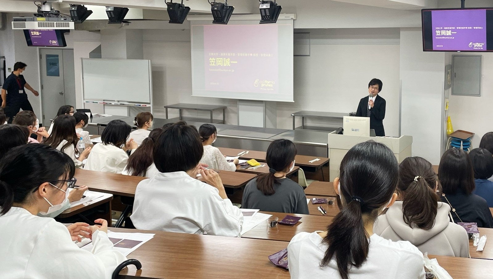 学生の皆さんには、プルーンを試食しながらの聴講をしていただき、プルーンとともに講義の内容を噛みしめていただきました。