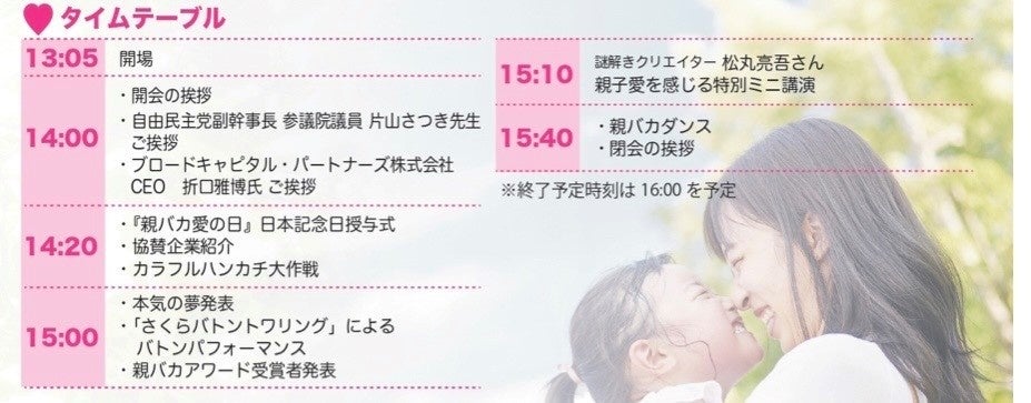 当日は参議院議員片山さつき先生ご挨拶に加え、日本記念日協会による8月8日「親バカ愛の日」の認定授与式、特別ゲストによる親子愛を感じる特別ミニ講演、子育てコンサルタント考案親バカダンスなどで親子愛を深めていただきます。