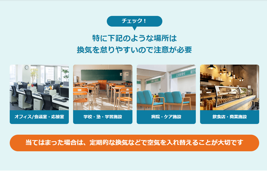 また二酸化炭素(CO2)濃度の数値が可視化されるだけでなく、換気の行動にしっかりとつながる機器からの発信・アラートが備わっていないと、「空気の入れ替え・換気」が見過ごされてしまいます。