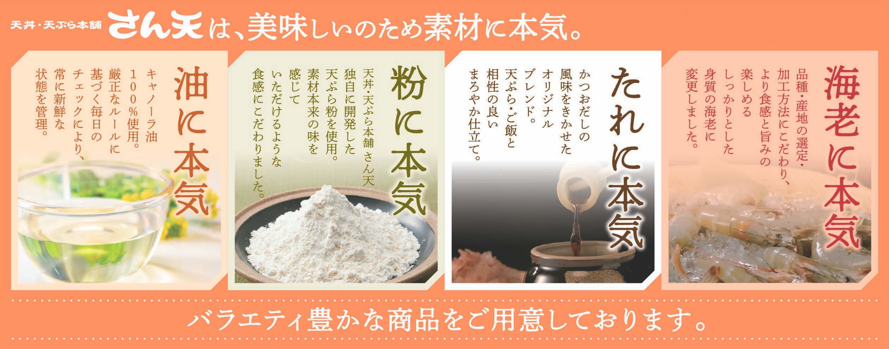 天丼・天ぷら本舗 さん天は「サクッとちゃんとごはん」をキャッチコピーに、早い・安い・熱々をコンセプトとした、天丼・天ぷら専門店です。