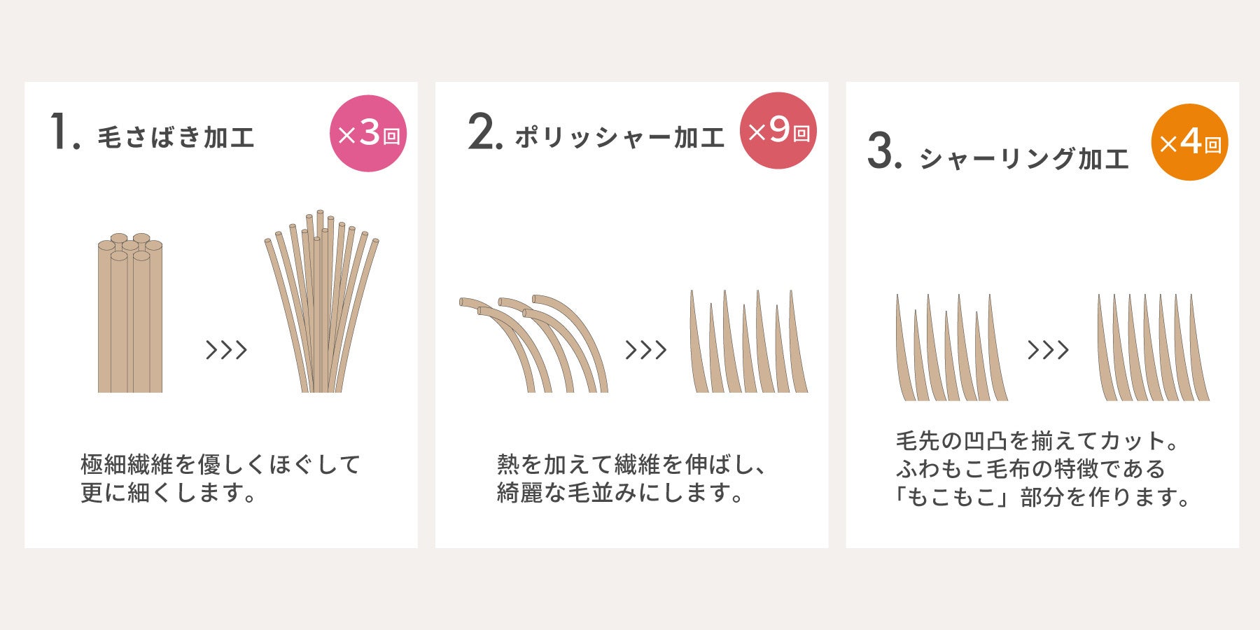 毛羽の長さが最高約3cmもあり、製造工程の「仕上げ」でふんわりと立ち上がるように加工しています。