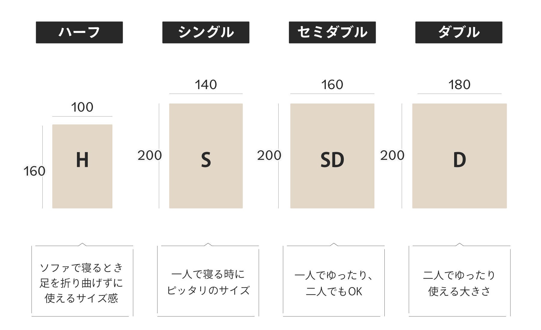 4サイズからお選びいただけるので、用途に合わせてソファでも寝室でも快適にお使いいただけます。