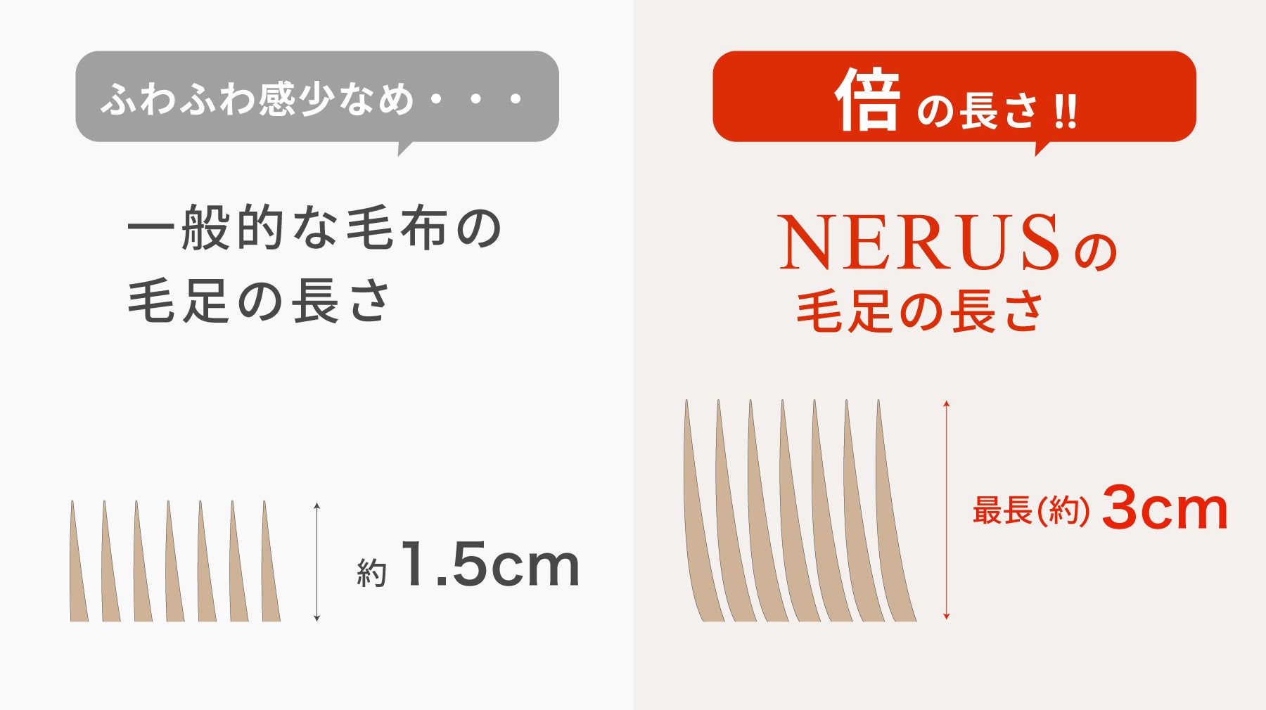 最も長い部分で3cm、短い部分で1.5cmの長さです。一般的な毛布の毛の長さが1~1.5cmなので、倍以上のふわふわ感をお楽しみいただけます。