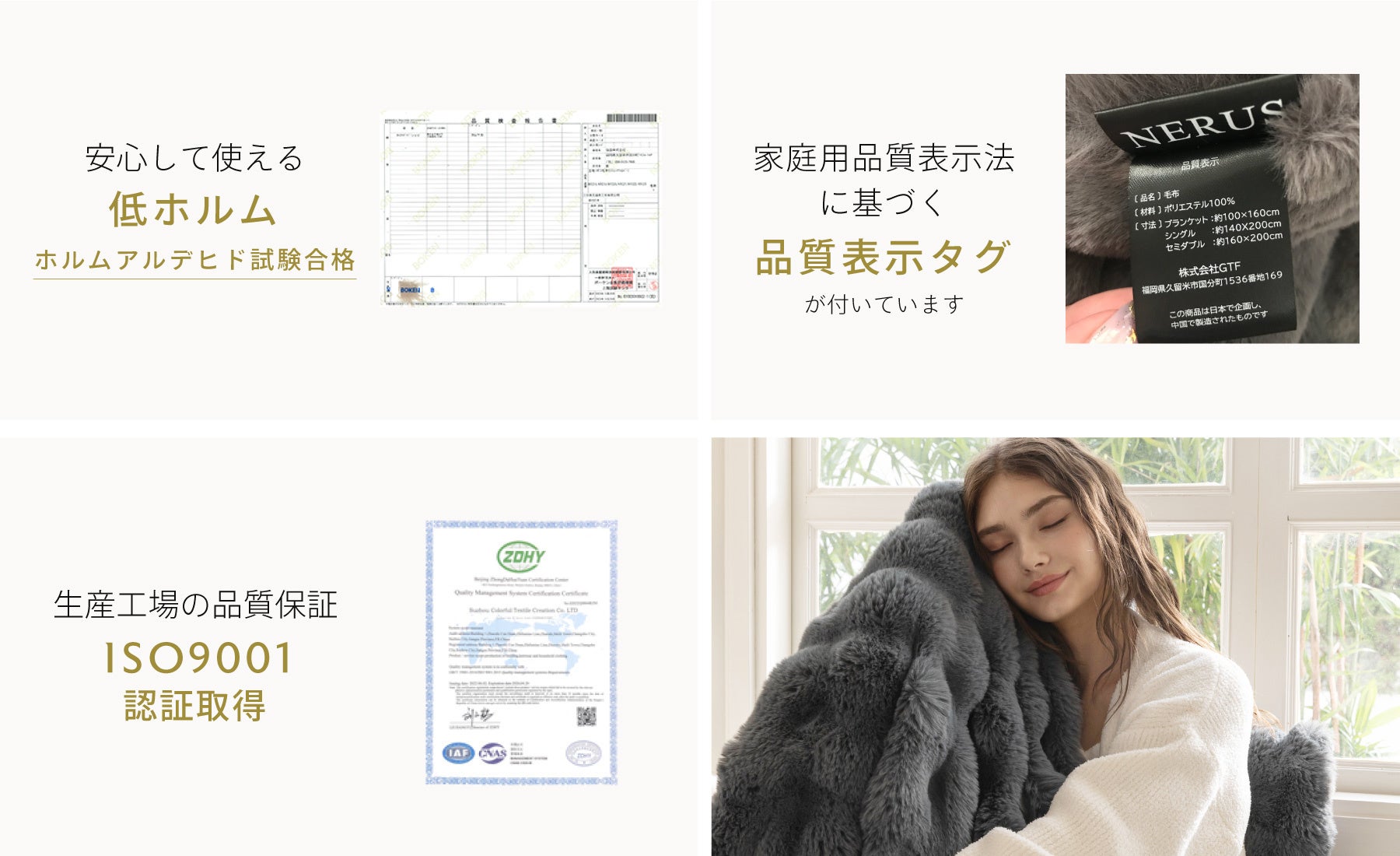 「家庭用品品質表示法」は、消費者が商品の購入をする際に適切な情報提供を受けることができるように制定された法律です。当社の毛布は家庭用品質表示に基づくタグがついており、安心・安全の毛布です。