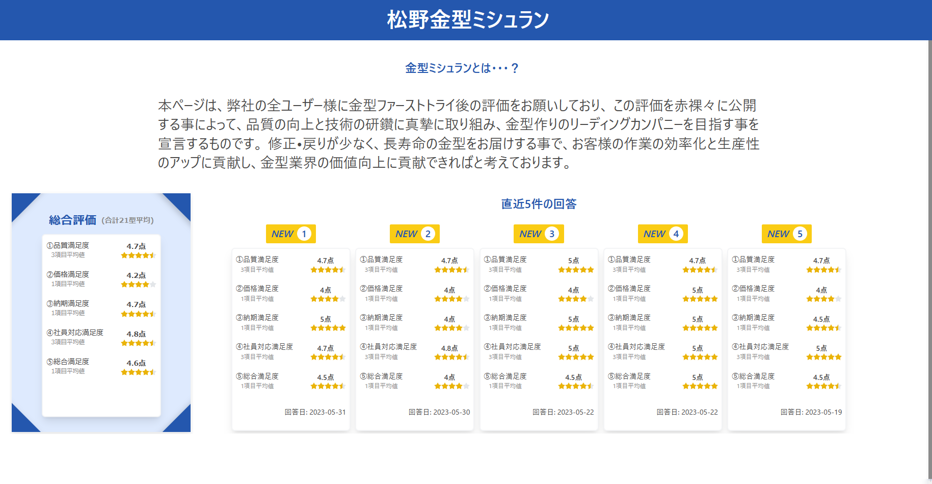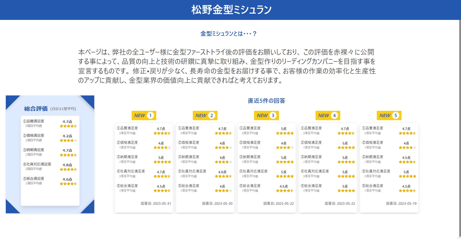 金型ミシュランは、当社の製品を発注元が評価し、インターネットで公開するカスタマーレビューサイトです。