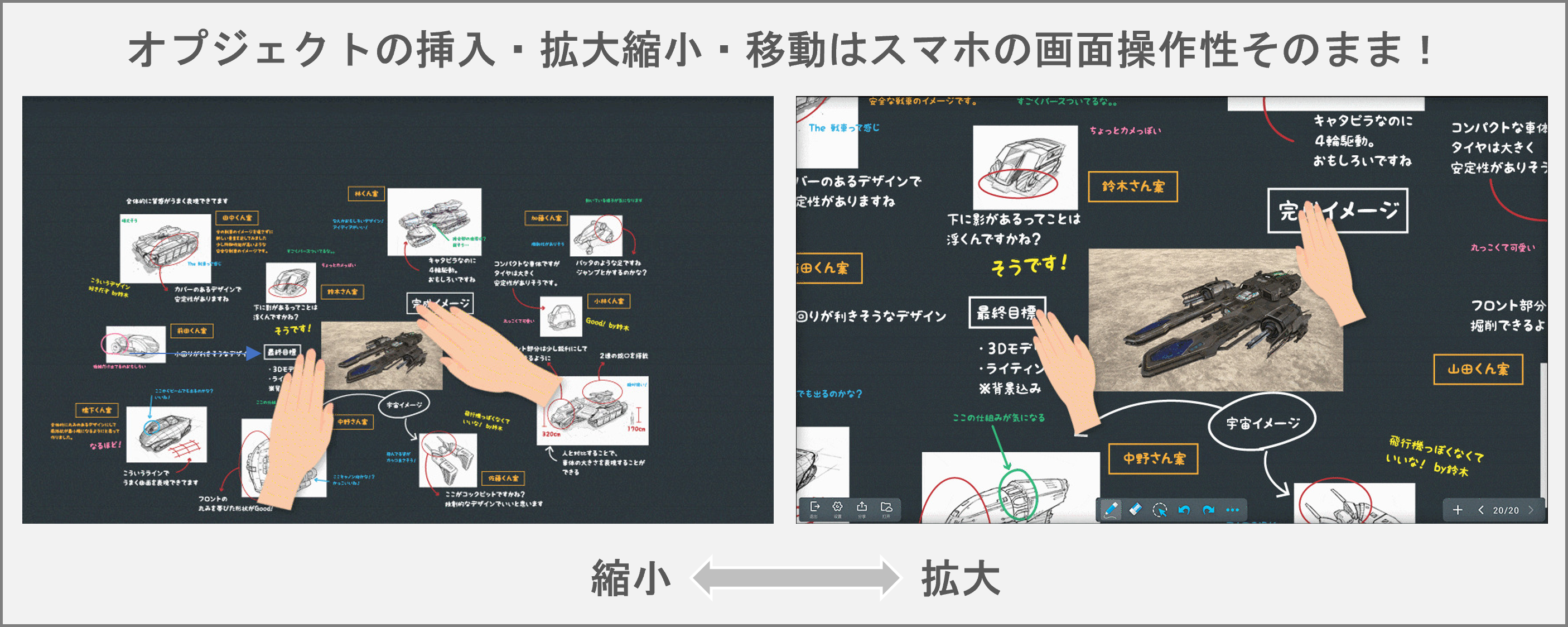 MAXHUBがあれば、資料・図面・画像―データを挿入することも、挿入したオブジェクトにメモやコメントを書き込むことが可能でそのままファイルとして保存が可能です。保存したファイルは再度編集することでき、またPDFファイルとして共有することが可能です。ページの追加やオブジェクトの拡大縮小、移動ができるので書き直す手間、消す手間を削減できます。