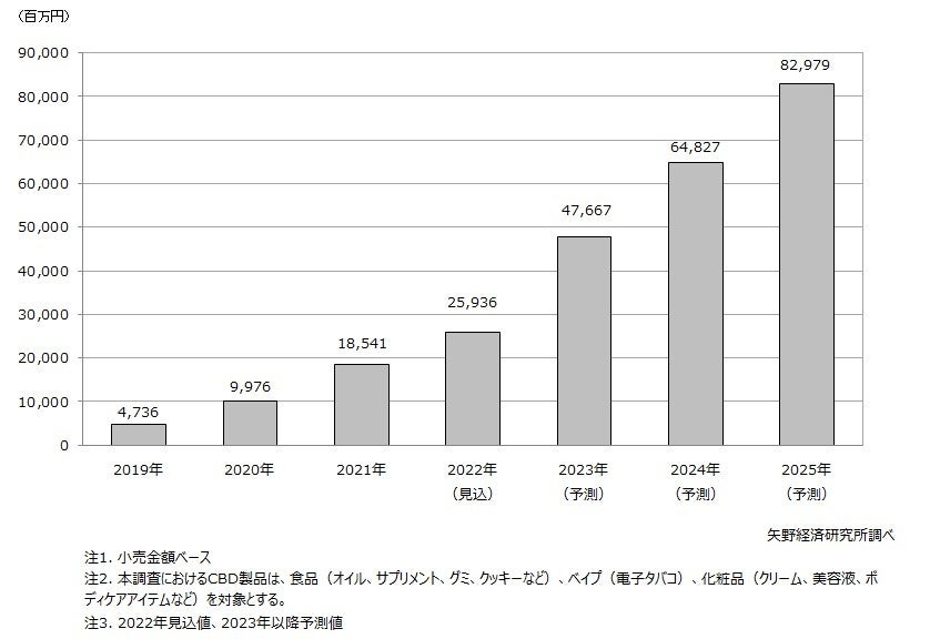 2022年8月時点で、2021年の国内CBD製品市場規模は185億4,100万円(小売金額ベース)、2022年はさらに前年比139.9%との予想(矢野経済研究所)でした。今後もさらなる市場の拡大が見込まれています。