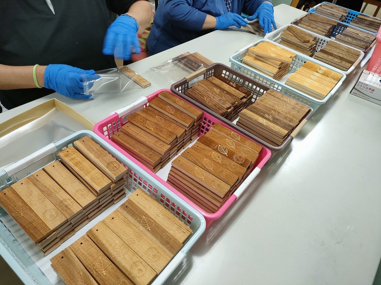 このリターン生産にあたり、就労継続支援B型事業所として障がい者支援を行うウイズ蜆塚に工程の一部を委託。2023年7月21日より、視覚障がいを持つ方々に銘木の袋詰め作業をしていただいています。