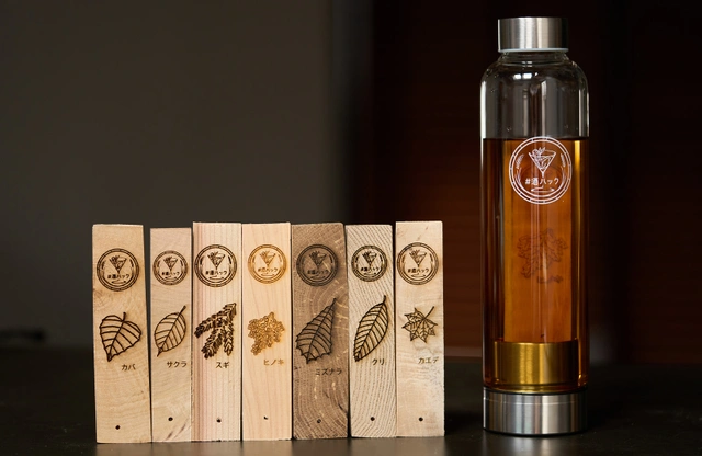 間伐材や家具を生産する際の余材を使った、お酒を手軽に熟成できるキット。専用のボトルにお好みのお酒を入れて銘木を漬けこむことで、最短半日でオリジナルの熟成酒をお楽しみいただけます。