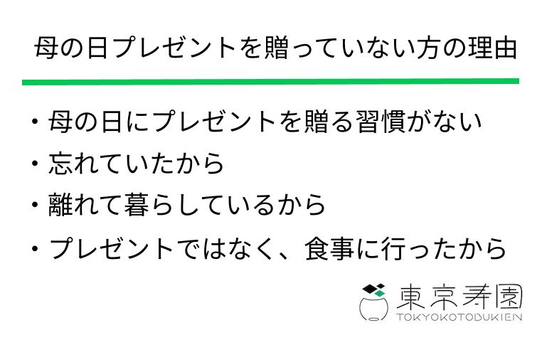 また、贈ってないと答えた方の理由は「習慣がない」「遠方にいるから」といったことが挙げられました。近年では、お花や観葉植物の業界でも通販需要が高まっています。遠方でもプレゼントを気にすることなく贈ることができるようになってきています。