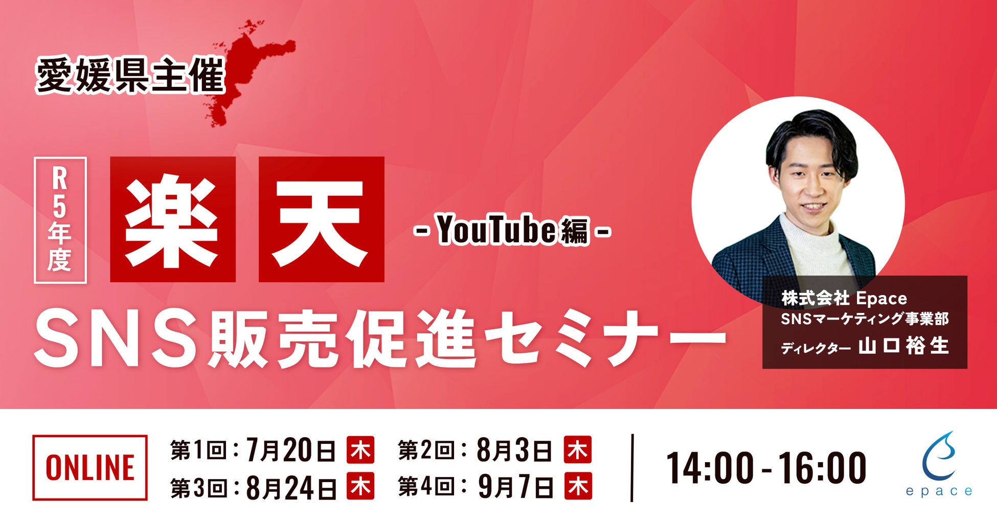愛媛県と楽天の共催のセミナー「楽天SNS販売促進セミナー -YouTube編-」は、愛媛県内の事業者様を対象に「YouTubeでの集客・販売促進」をお伝えするセミナーとなっております。そして今回、セミナーの講師を、SNSマーケティング事業部ディレクターの山口 裕生(やまぐち ゆうき)が務めさせていただきます。