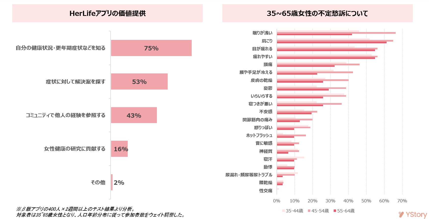 HerLifeは、2週間超にわたり400名へのベータテストを実施し、以下の結果を明らかにしました。参加者の選定は35歳から65歳の女性のうち自然分布に基づくサンプリングしました。