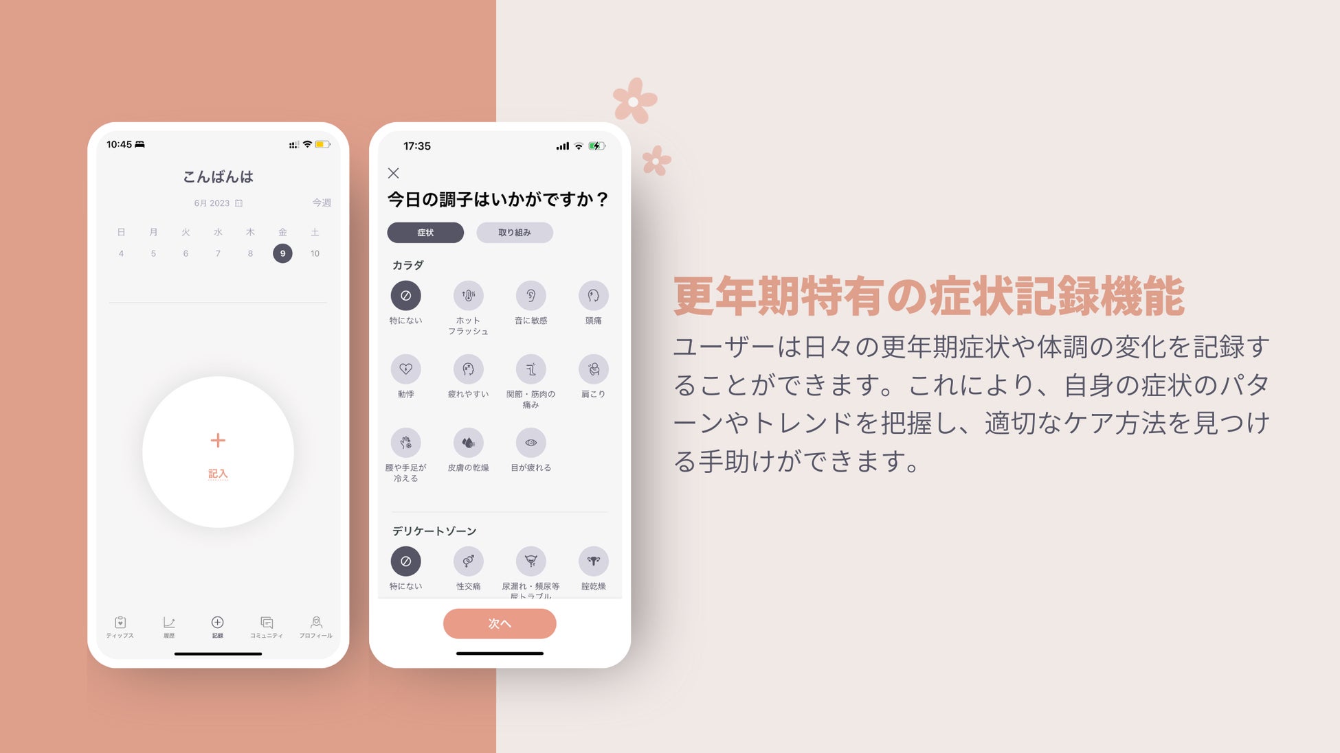 2. 更年期特有の症状記録機能:ユーザーは日々の体調の変化や、その時感じた更年期症状を記録することができます。これにより自身の症状のパターンやトレンドを把握し、適切なケア方法を見つける手助けを提供します。