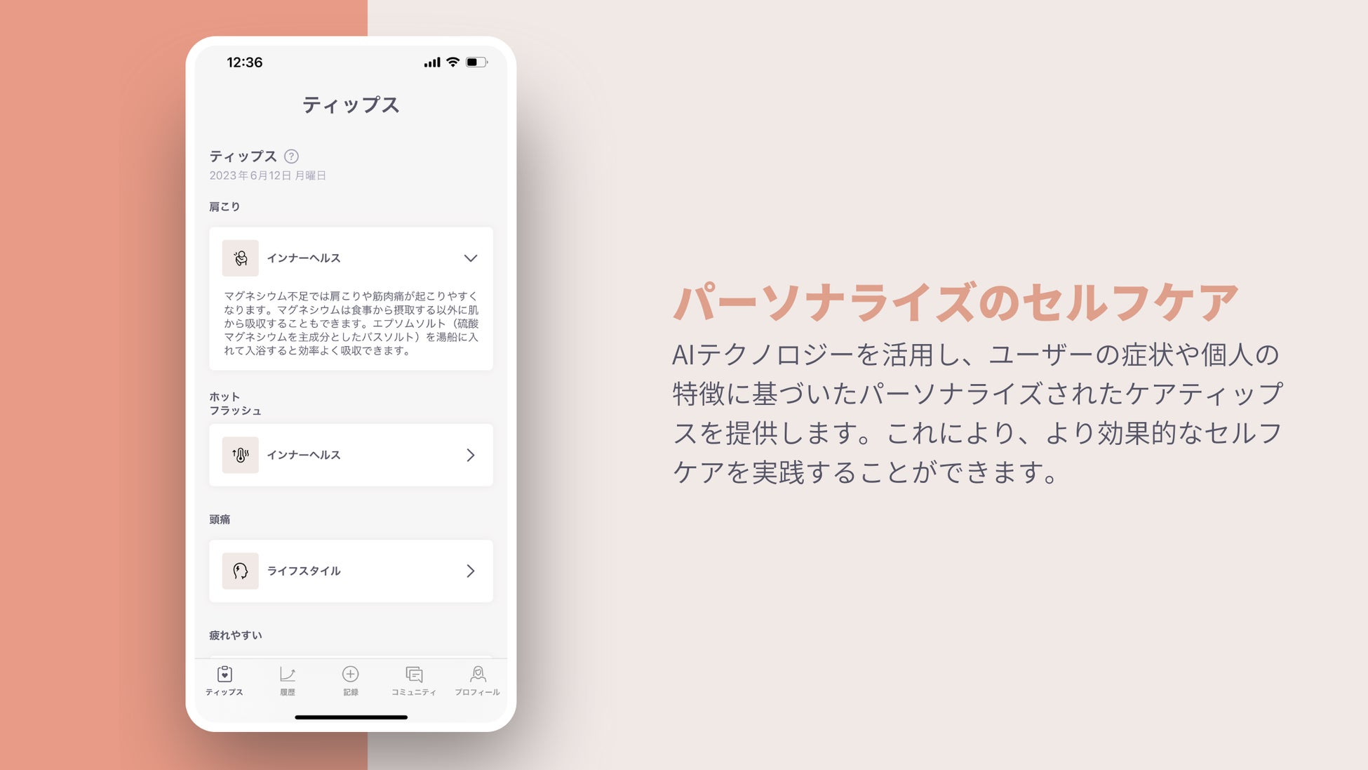 1. パーソナライズされたセルフケアティップス:AIテクノロジーを活用し、ユーザーの症状や属性に基づく個別のセルフケアティップスを提供します。これにより、より効果的なセルフケアを実践することができます。