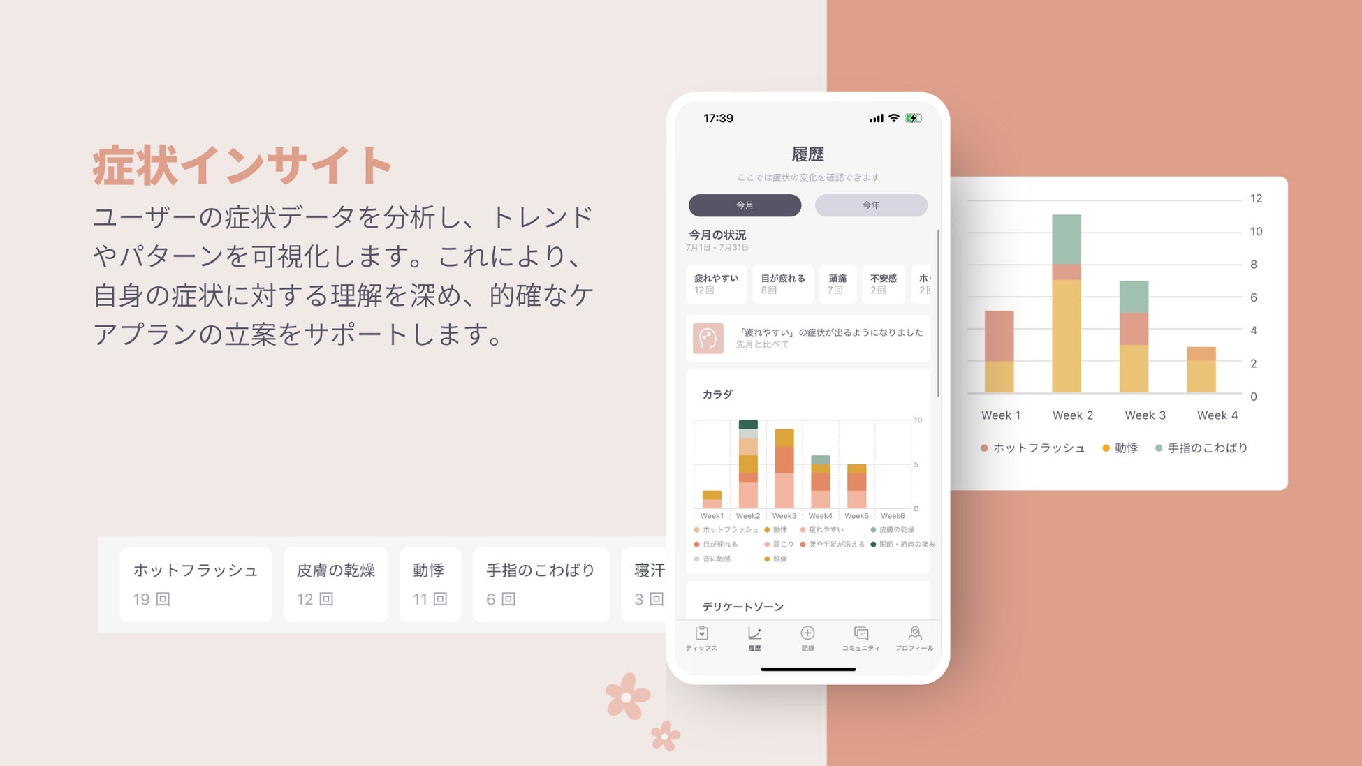 4. 症状インサイト:HerLifeアプリは、ユーザーの症状データを分析し、症状のパターンやトレンドを可視化します。これによりユーザー自身に対して体調変化への気付きや理解を促し、的確なケアプランの立案をサポートします。