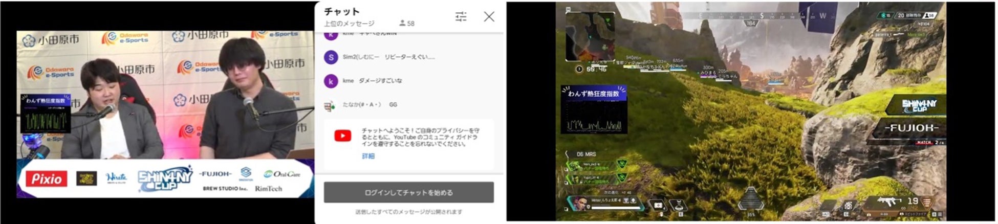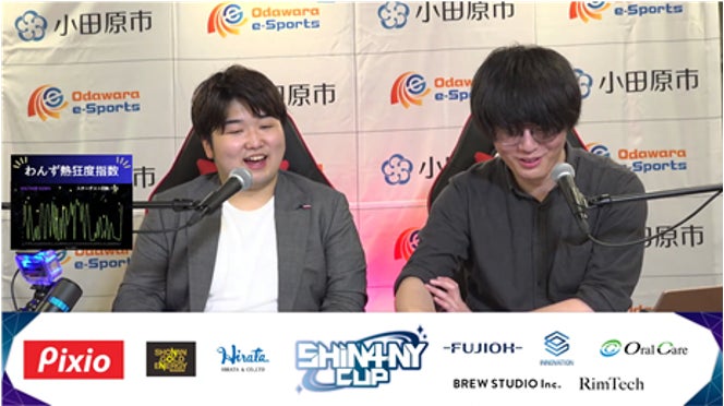 今回の実証試験では、e-Sportsの熱狂度を数値化するため、会場のCO2数値や、実況者の音声解析、心拍や脈波を測定することで因果関係の確認を行いました。今回、SHIN4NYでは、実況者(わんず様)の音声解析を行い、ボルテージ指数の算出を行いました。なお、このボルテージ指数は「わんず熱狂度指数」として、大会開催中、リアルタイムに会場のモニターに表示されるとともに、YouTubeライブにおいても配信されました。
