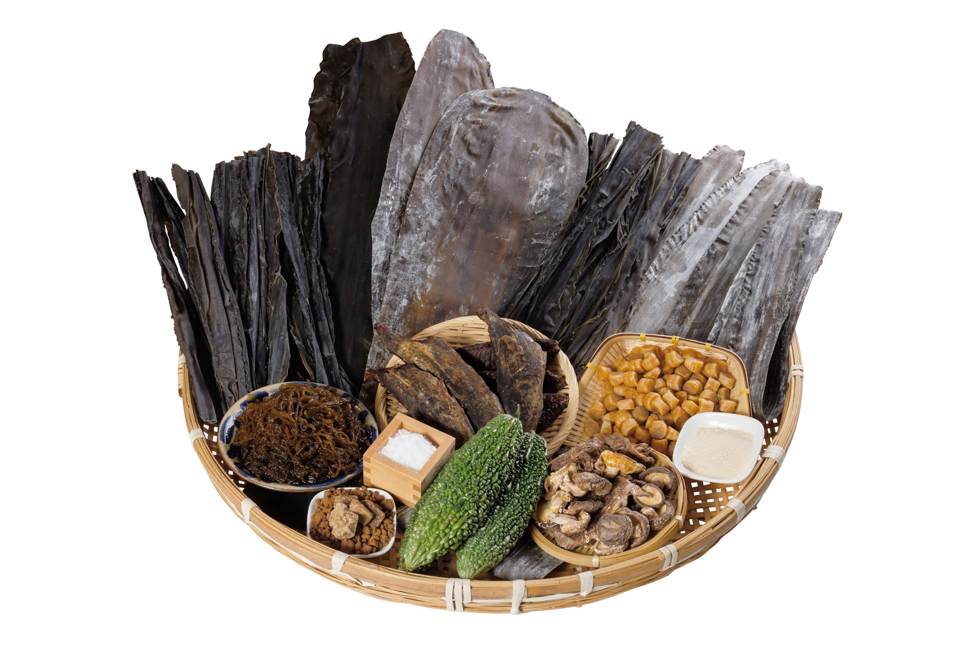 北海道産羅臼昆布・利尻昆布・日高昆布・真昆布・長昆布に同じく北海道産の干しホタテ貝柱や国産のかつお節や干し椎茸、沖縄の太陽の日をたっぷり受けた沖縄県産のゴーヤにもずく、沖縄県産の「青い海」海水塩や黒糖を一部使用。さらにポークエキスも加えました。