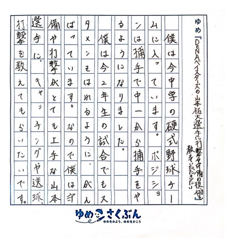 僕は今中学の硬式野球チームに入っています。ポジションは捕手で中一から捕手をやるようになりました。僕は今2年生の試合でもスタメンをはれるように、がんばっています。なので、僕は守備や打撃がとても上手な山本選手にキャッチングや送球、打撃を教えてもらいたいです。