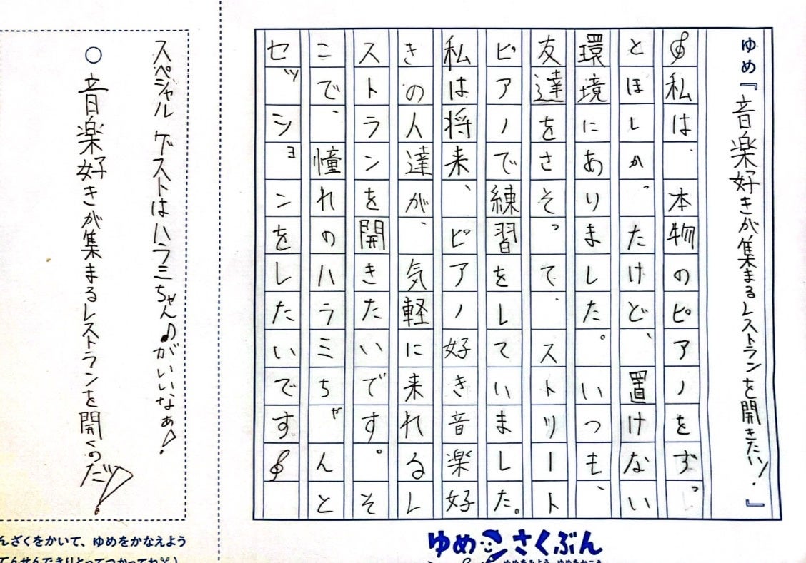♪私は、本物のピアノをずっと欲しいと思ったけど、置けない環境にありました。いつも、友達をさそって、ストリートピアノで練習をしていました。私は将来、ピアノ好き音楽好きの人達が、気軽に来れるレストランを開きたいです。そこで、憧れのハラミちゃんとセッションしたいです!