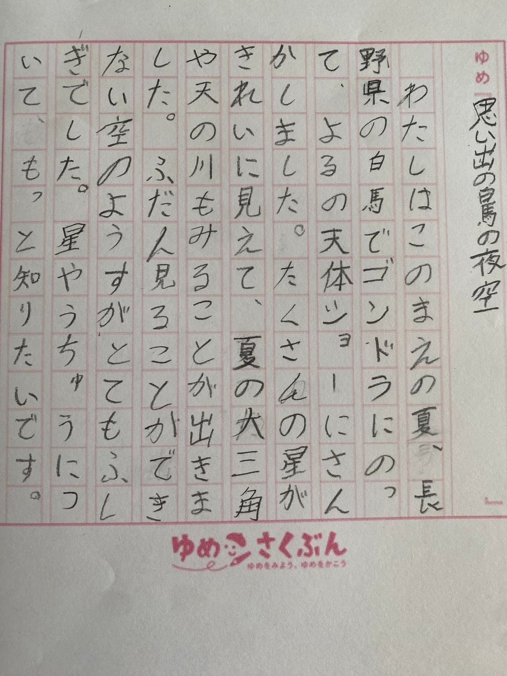わたしはこのまえの夏、長野県の白馬でゴンドラにのって、よるの天体ショーにさんかしました。たくさんの星がきれいに見えて、夏の大三角形や天の川もみることが出きました。