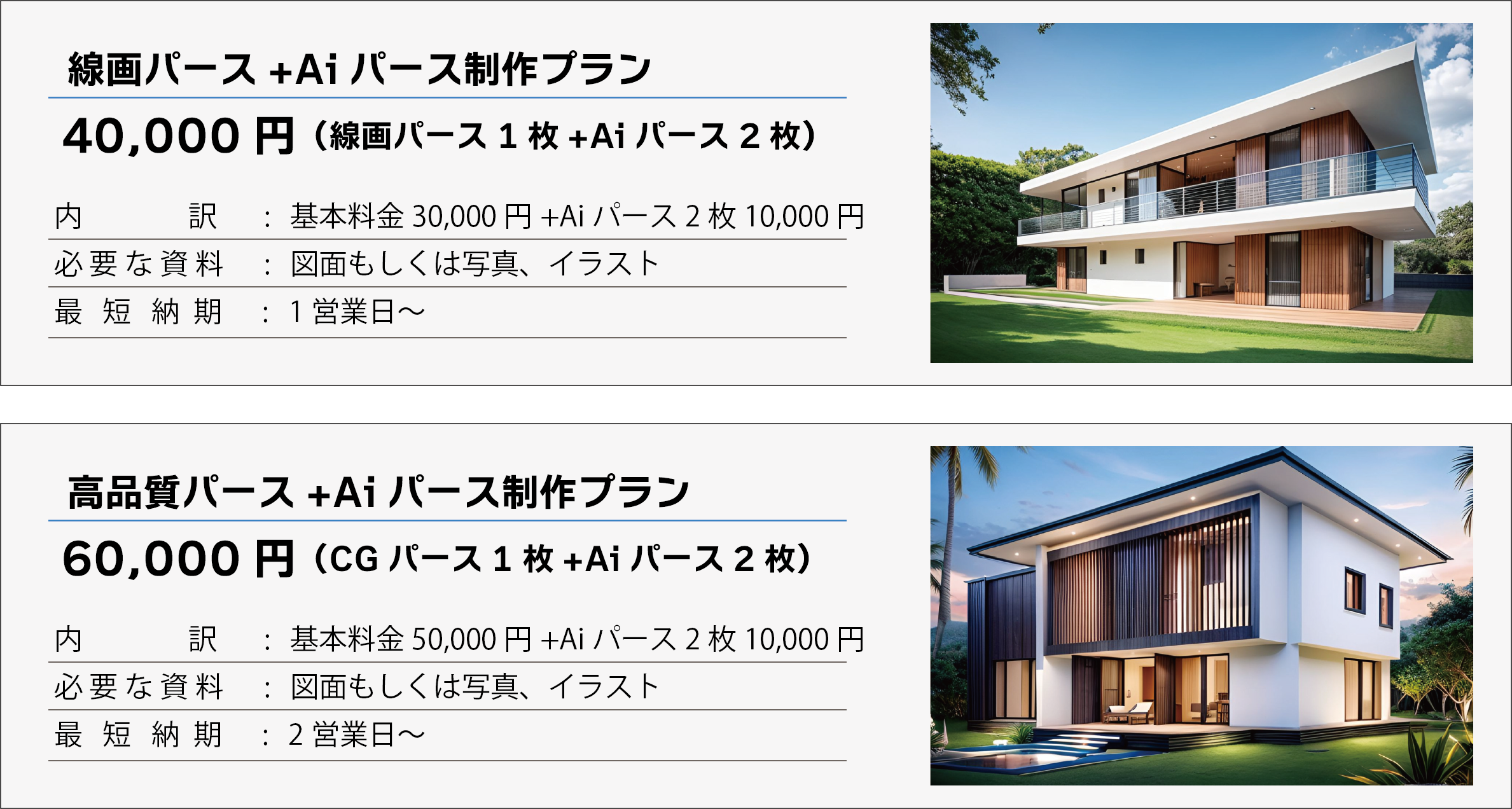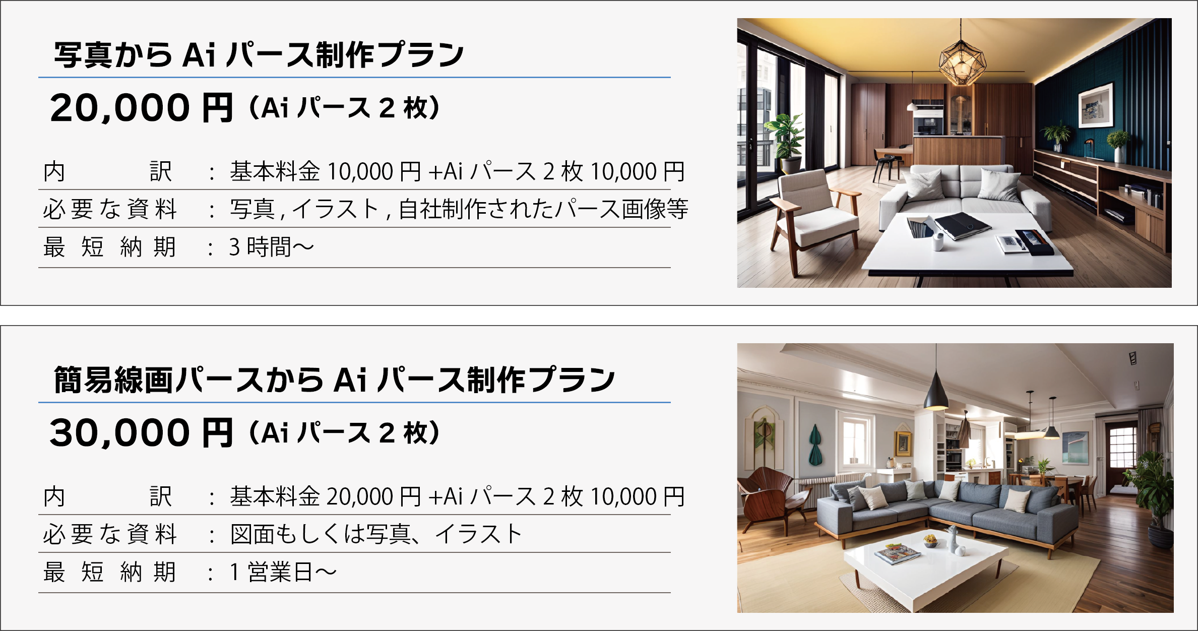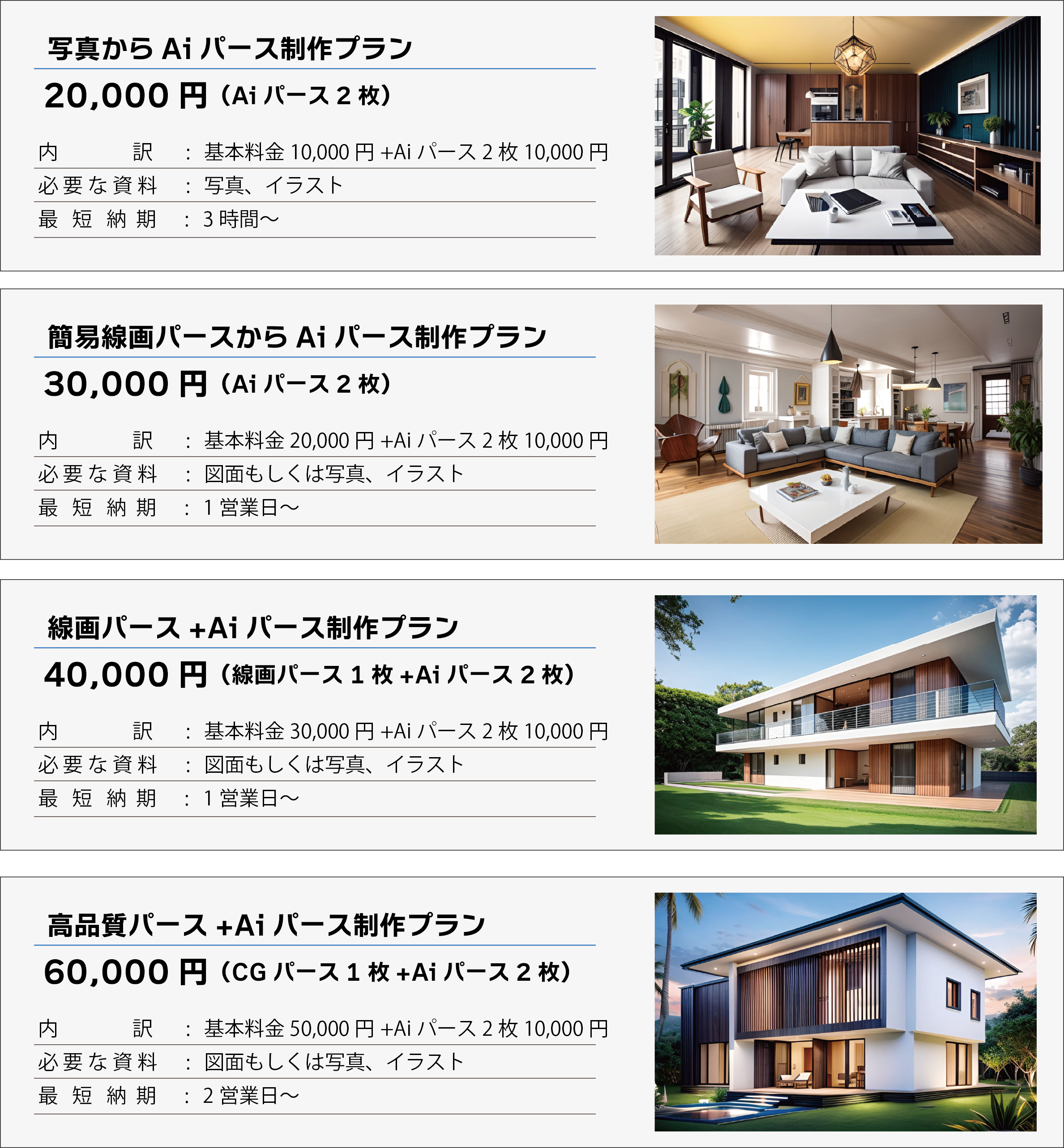 図面、写真情報をもとに制作された線画パースをベースに、Aiによりデザインされた高品質な建築Aiパースから選べる画期的なサービスです。