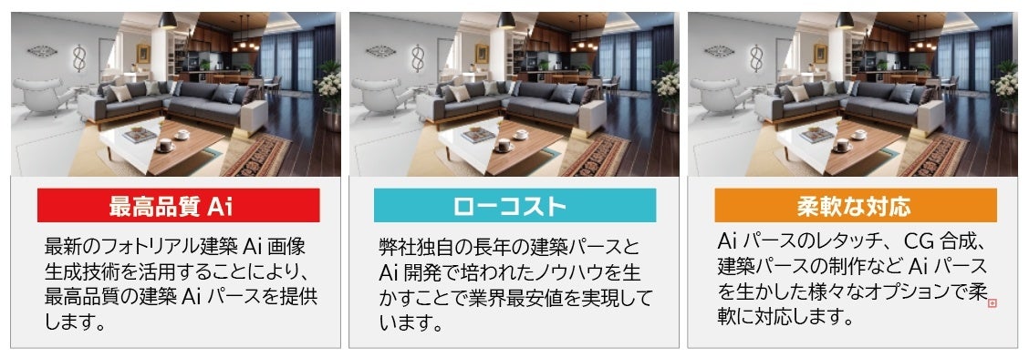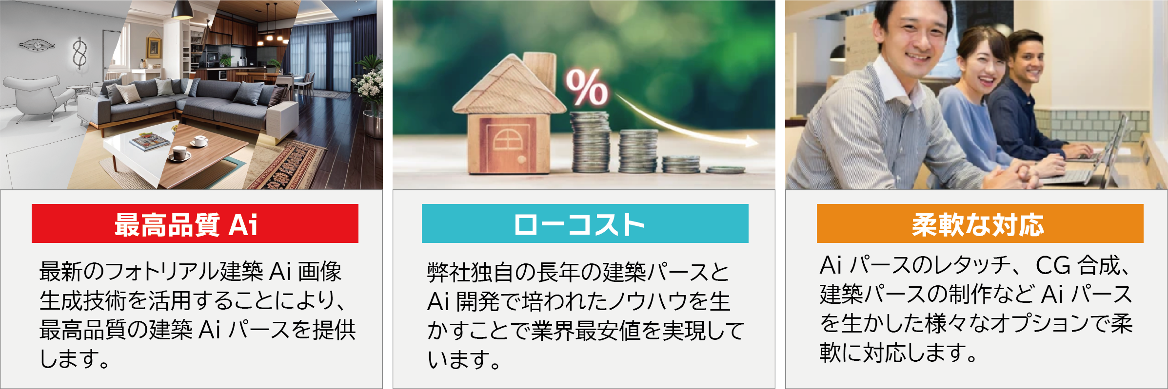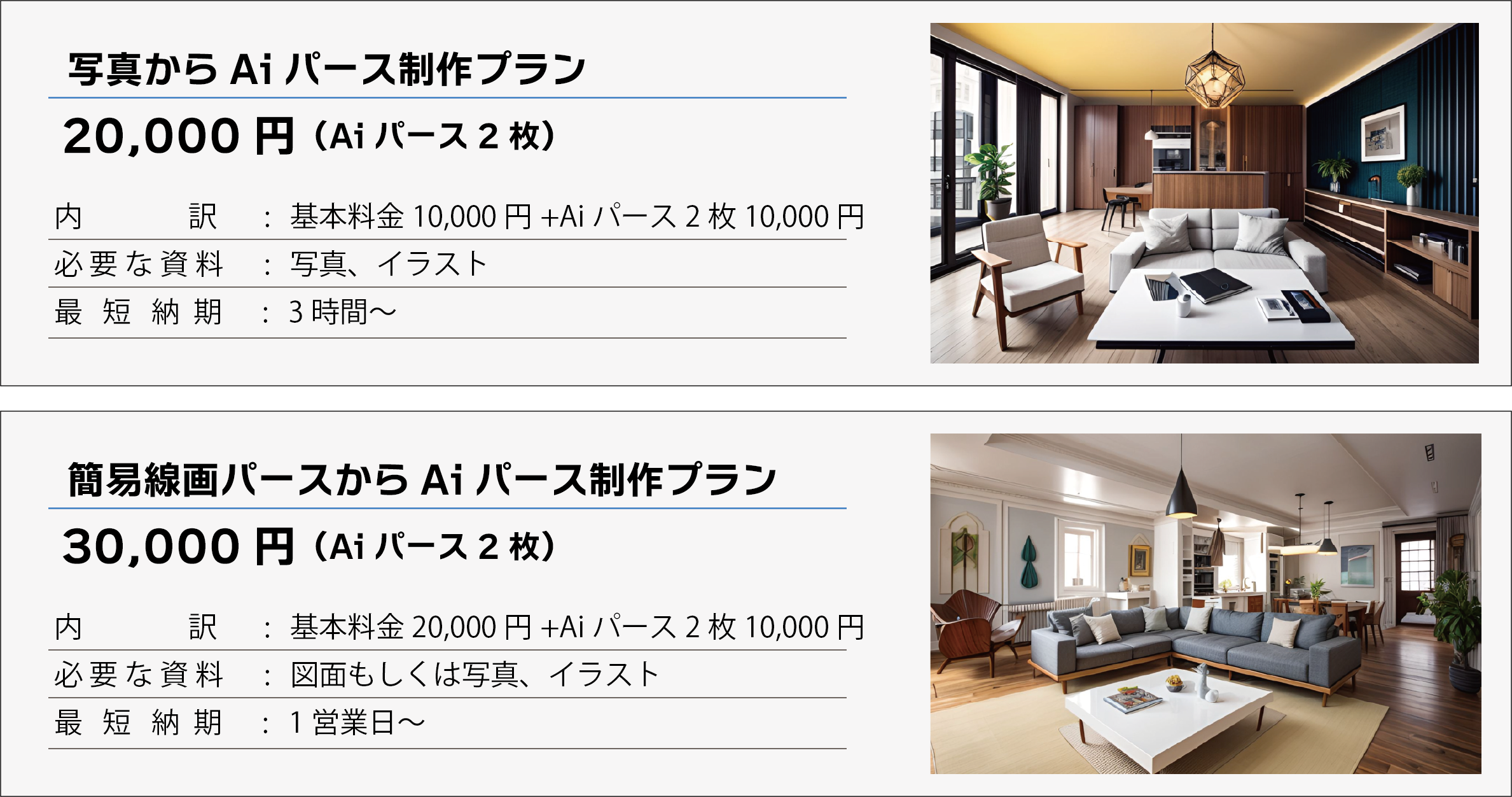 弊社の長年にわたる建築パースとAi開発のノウハウを最大限に活用し、業界最安値を実現しています。
