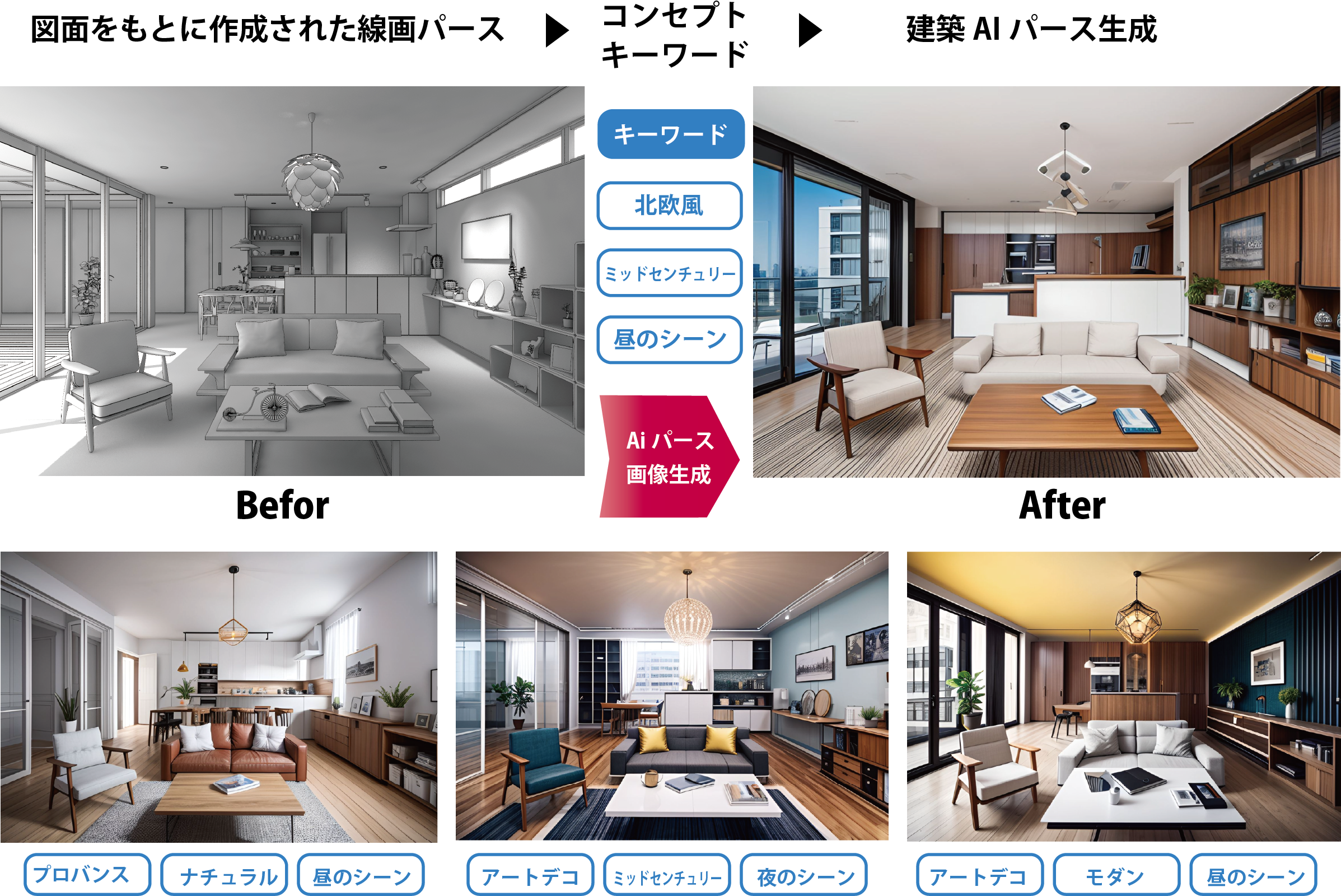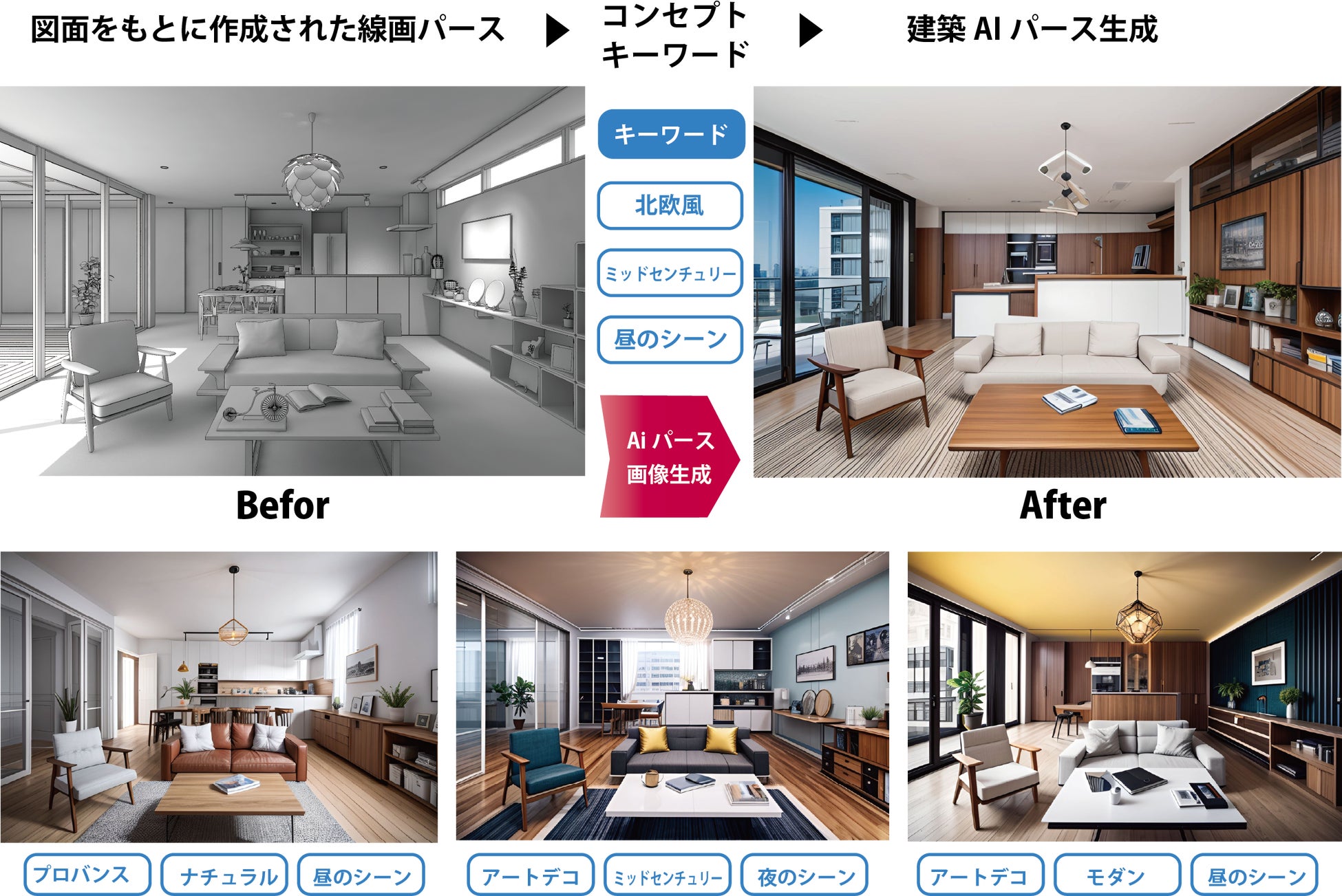 建築パースのプロフェッショナルが生成する建築、インテリアに特化したAi画像生成パースデザインサービスです。図面、写真を基にAiがフォトリアルなAiパースを作成し、空間の大きさや形状、レイアウトを維持したまま、フォトリアルな建築Aiパースデザインが短期間で納品可能です。また常に進化し続けるAi技術で成長し続けるサービスです。