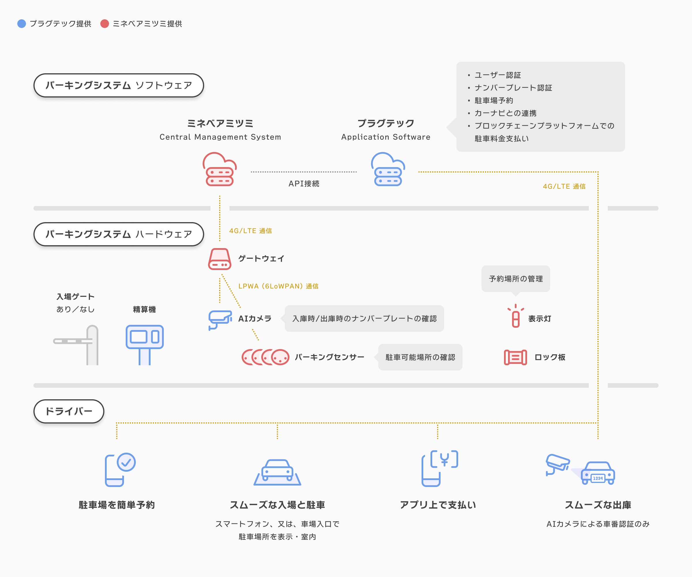 両社が共同で実証事業を行う次世代の駐車場システムは、プラグテックの持つAI・ブロックチェーン・クラウドサービス関連技術と、ミネベアミツミの持つセンサーやネットワーク構築技術を融合することで、飯塚市のユーザーの利便性と駐車場運営者の収益性を大幅に向上させます。