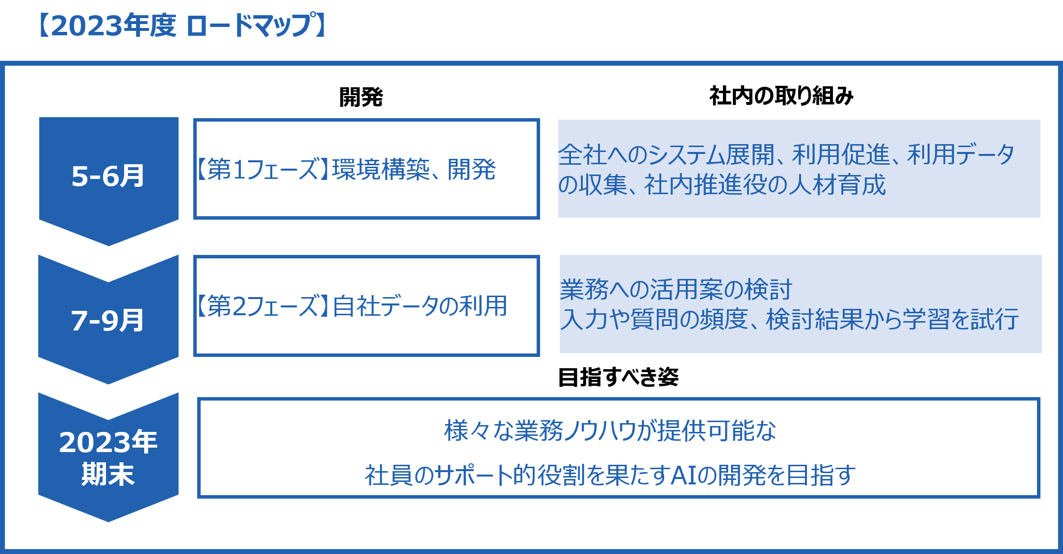 今回導入した「NK-AIbot Powered by GPT-3.5」の開発は現在第1フェーズにあり、年内に自社データの利用を可能にする第2フェーズの開発を予定しております。当システムを、業務の標準化や効率化、サービス品質の平準化に資するAIとして開発をすすめるとともに、AIに関するマニュアルの整備や研修、活用の推進役となる社内の人材育成等を実施し、全社的な活用を促進してまいります。