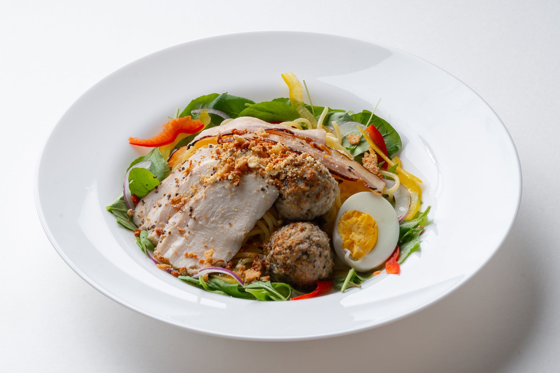 自家製ベーコン、丹波鶏むね肉の低温塩チャーシュー、自社養鶏煮卵、しいたけの旨味たっぷり鶏つくねをトッピングしたパスタ。ヒラヤミルクベースの濃厚チーズソースが、口いっぱいに広がるクリーミーな味わいを演出します。温かい生パスタと混ぜ合わせることで、各食材の旨みが引き立つ、食べ応えある一皿です。
