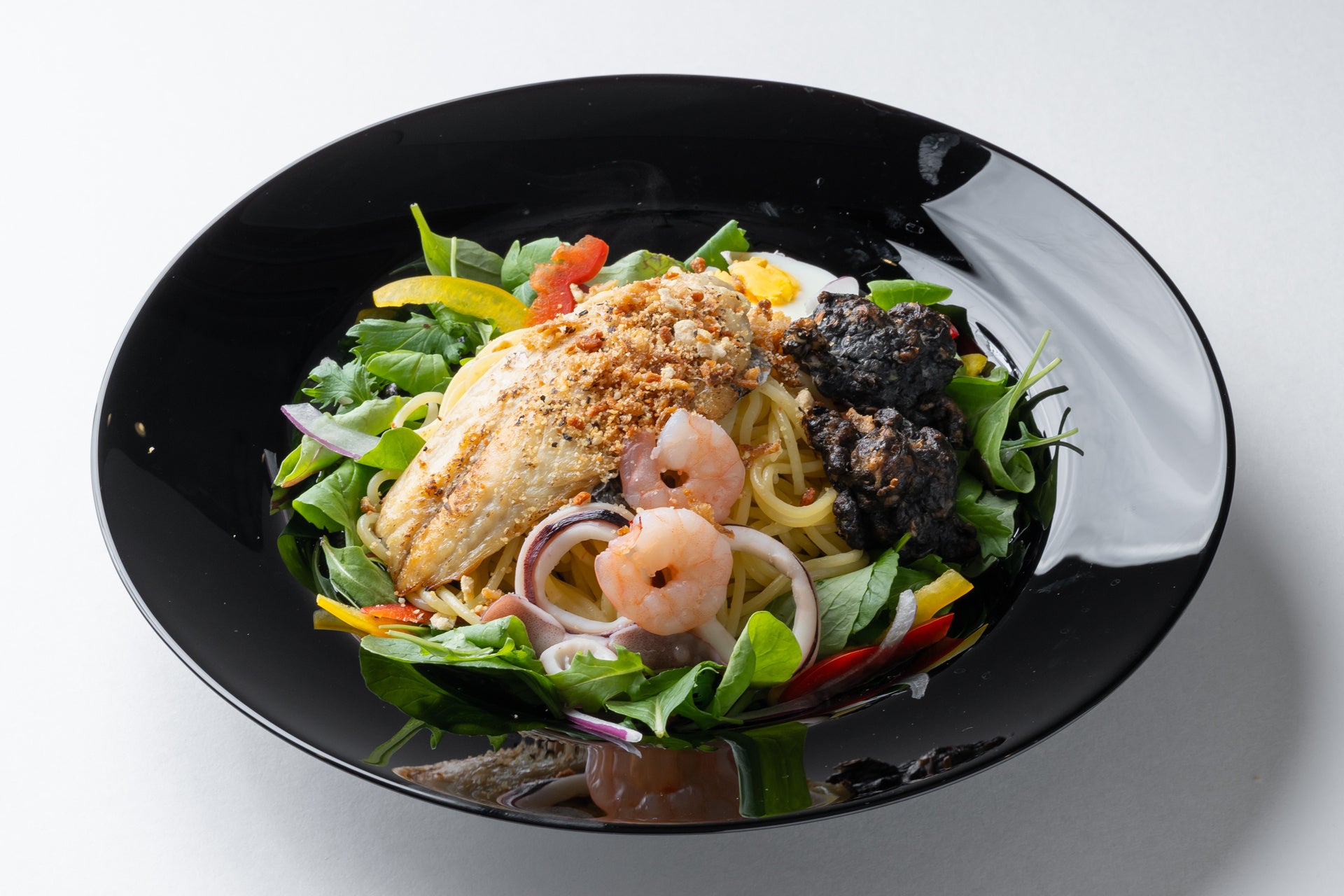 舞鶴産の旬の魚の短期熟成グリルと、イカスミ入り自家製つみれ、自社養鶏の煮卵をトッピングしたパスタです。濃厚トマトと野菜ベースのソースに白ワインとイカスミが深みを加えます。温かい生パスタと具材、ソースを混ぜて完成する、舞鶴の旨みが詰まった一皿です。