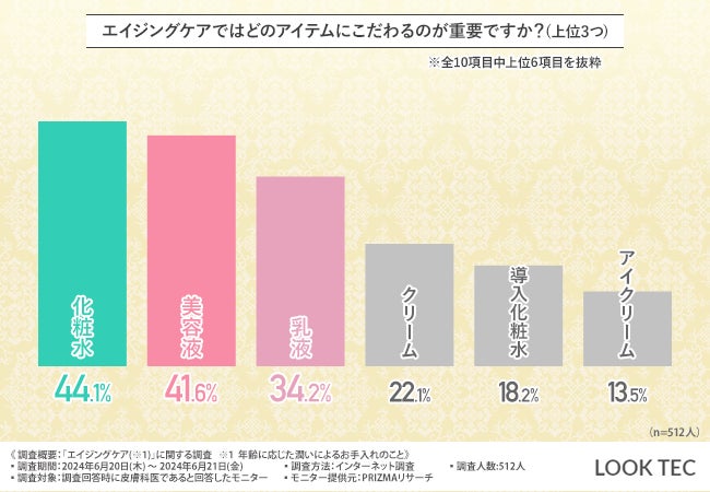 そこで、「エイジングケアではどのアイテムにこだわるのが重要ですか?(上位3つ)」と質問したところ、『化粧水(44.1%)』と回答した方が最も多く、次いで『美容液(41.6%)』『乳液(34.2%)』と続きました。