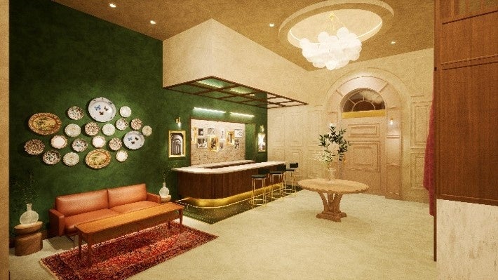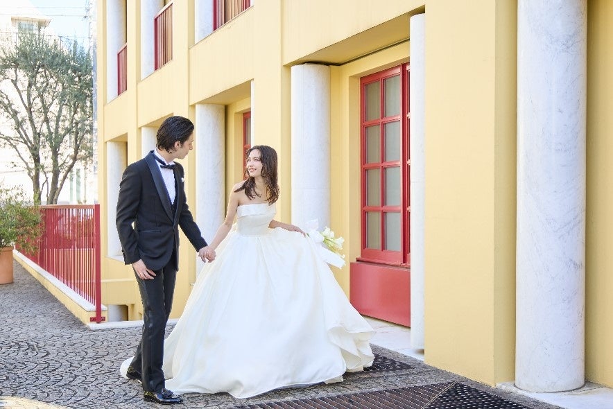 Dresses Studio AOYAMAのフォトスタジオの舞台となるのは、世界的建築家アルド・ロッシが手掛けた建造物の中。その外観はイタリア建築を象徴する、ブルーの御影石に大理石造りのファサードが迎えるエントランス、赤の窓枠が映えるイエローの外壁が特徴的で、まるでふたりの特別な1日のはじまりを知らせてくれるよう。