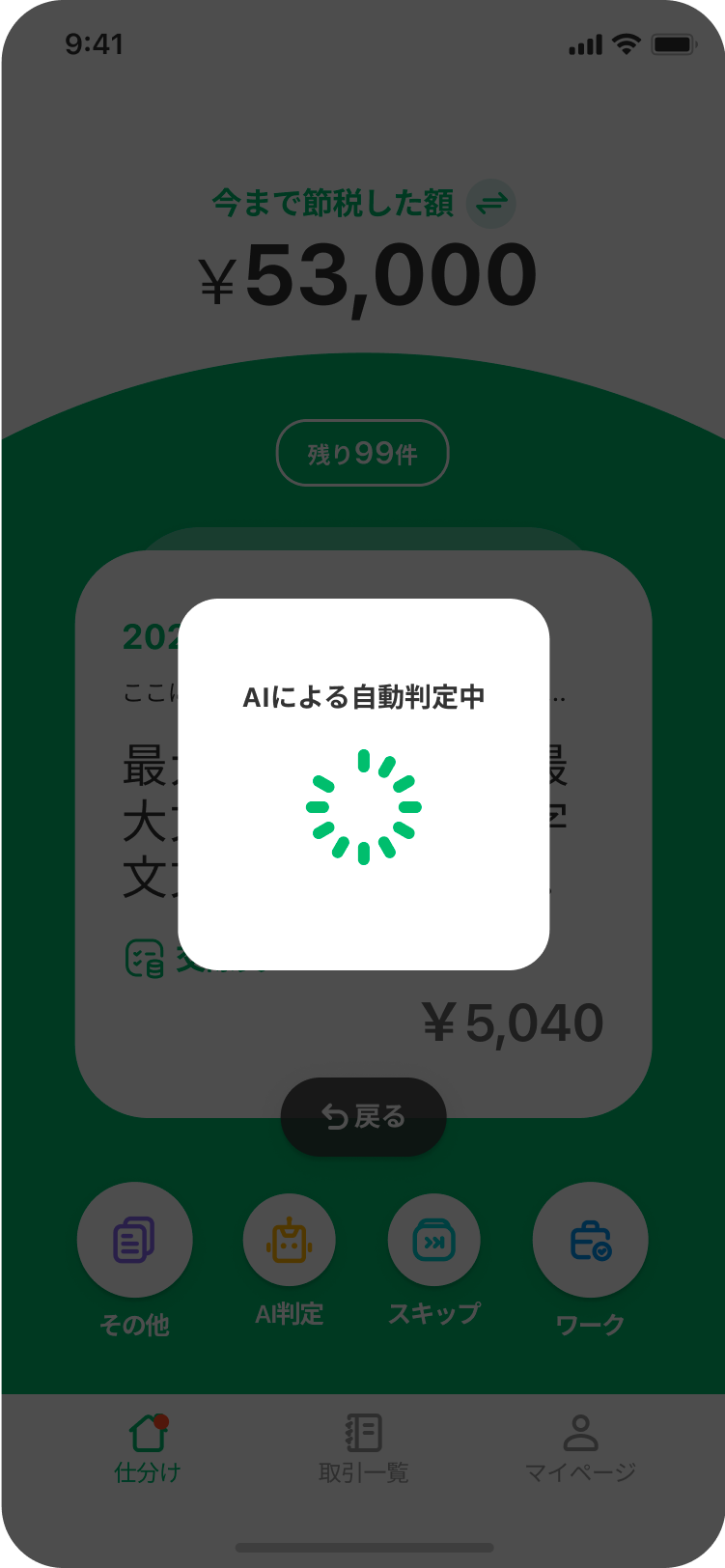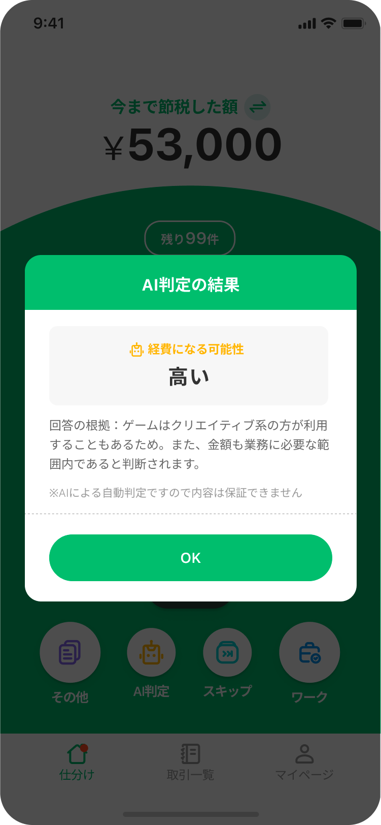 AI判定は「この取引、経費として申請できるかどうか分からない」という悩みを解決する革新的な機能です。
