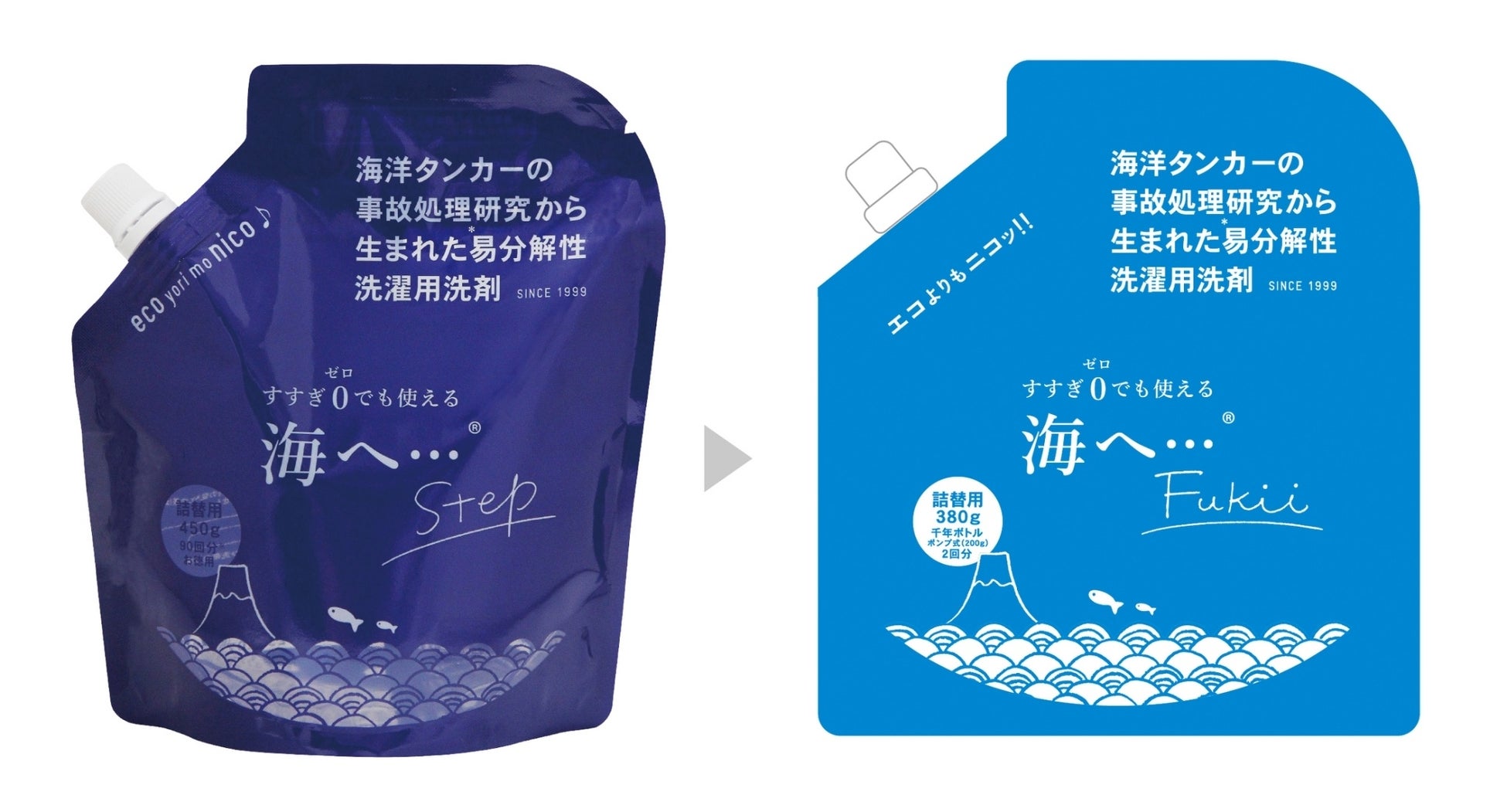 1999年 濯ぎ1回の洗濯洗剤『海へ…』を発売し、2019年に濯ぎ0回の洗濯洗剤『海へ…Step』が誕生しました。その間『海へ…』で海をきれいにしたい!という輪が広がり、現在は全国数十万世帯の方に愛用される洗濯洗剤となりました。その後も研究開発を続け、洗浄力の大幅な向上に成功。この度、電気代ゼロ洗浄も可能なゼロ濯ぎ洗剤『海へ…Fukii』へとリニューアルしました。