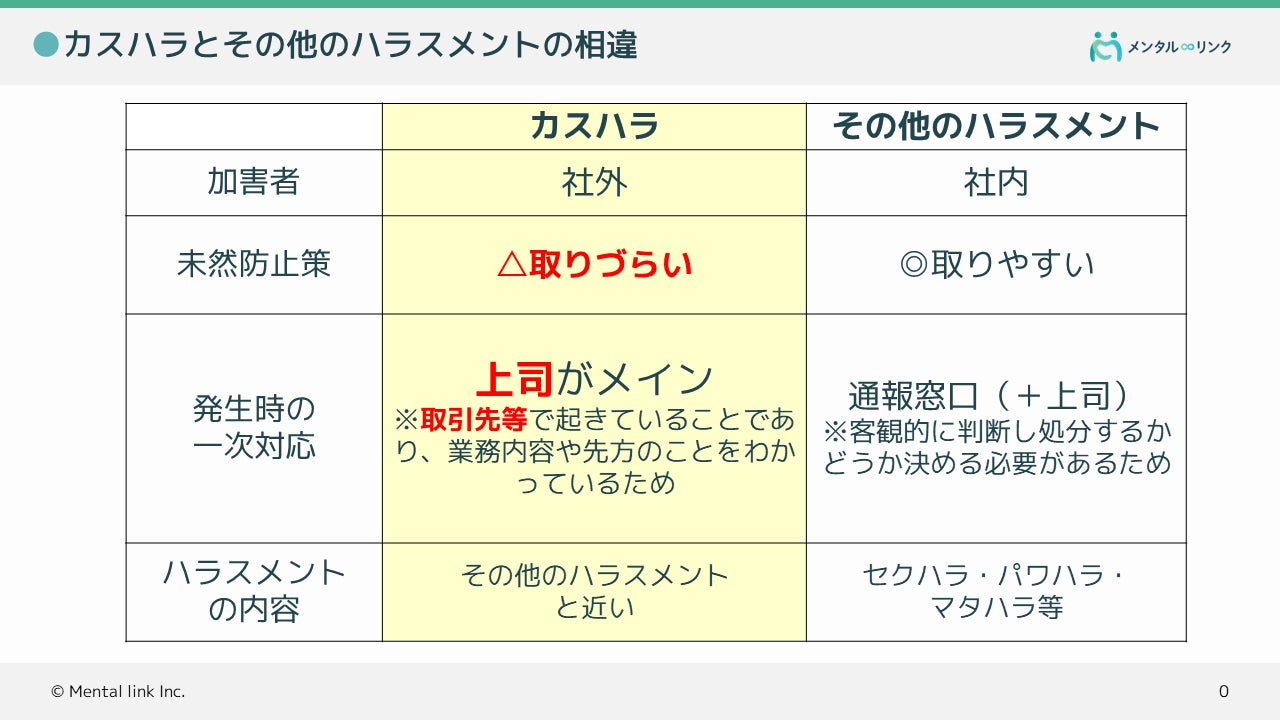 昨今話題のカスタマーハラスメント(カスハラ)。マニュアル等、様々な対策が広まりつつあります。多くのものは「B to C」企業向けで、エンドユーザーからのカスハラへの対策となっております。しかし、取引先や関連会社、グループ会社からのカスハラに困っている企業や管理職から相談を多くいただいております。そこで、株式会社メンタル・リンク(東京都千代田区、代表:宮本剛志、以下「当社」)は、B to B(企業 対 企業)型のカスハラに特化した対策プログラム(役員・管理職・担当窓口向け)を公開いたします。すでに複数の企業で研修を実施し、「とても参考になった」「早速、部下と共有しました」等の声が届いております。カスハラ対策は、退職防止等につながるという調査結果もあるように、企業として取り組む課題となります。B to B型のカスハラ対策で困った際には、当社にご相談ください。