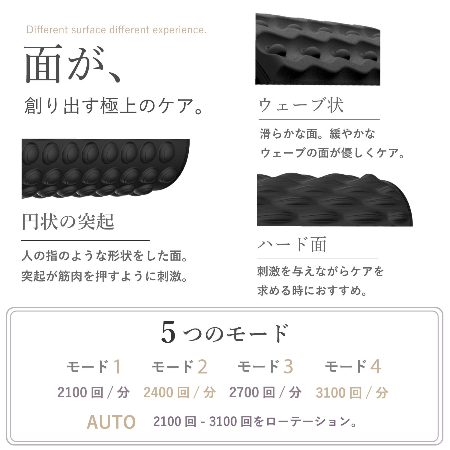 フォームローラーのように使用をする際は、3つの異なる面からお好みに合わせた面を使用して重点的にストレッチやボディケアが可能です。振動の強さの調整もまた可能です。
