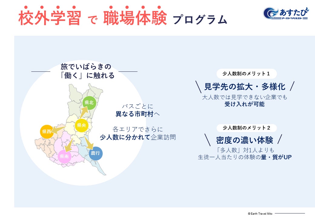 アーストラベル水戸㈱(本社:茨城県水戸市、代表:尾崎精彦)は中学生を対象に、地域に根付いた産業の体験を盛り込んだ職場体験型校外学習プログラム(以下、本プログラム)をスタートいたします。本プログラムではバスごとにコースを設定。各コース茨城を代表する地域事業者のもとを少人数選択制で訪問し、職場体験を行います。コロナの影響により職場体験受入れ先が減少し、教員の負担が増えている現状を改善しつつ、地域の仕事や大人に触れることでシビックプライドを醸成し、将来の職業選択につながるきっかけを提供することを目指しています。