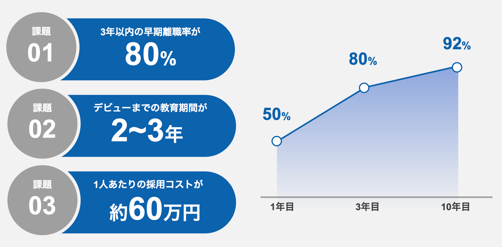 特に早期離職に関しては深刻で、新卒入社から1年以内に50%が離職すると言われており、3年目までになると80%が離職するというデータがあります。つまり大半はアシスタント期間で離職するということです。主な離職理由としては人間関係や雇用条件、実際の働き方、体力や身体面で離職すると言われています。