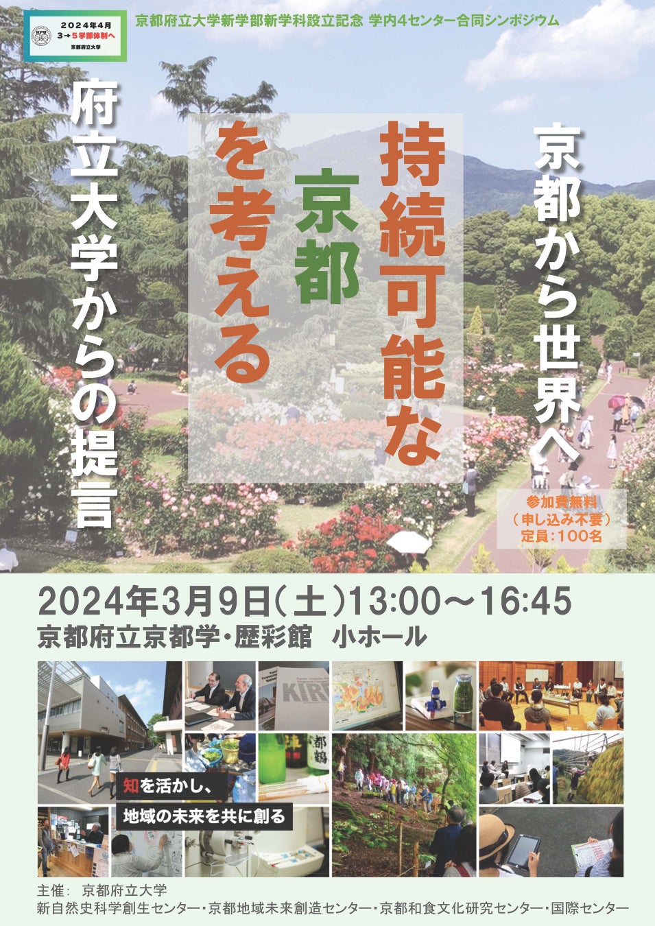 令和6年4月、京都府立大学は学部・学科を再編し、現行の3学部12学科から5学部12学科を擁する総合大学へと生まれ変わります。これを記念して、2024年3月9日(土)に府立大学初となる学内4センター合同シンポジウムを開催します。