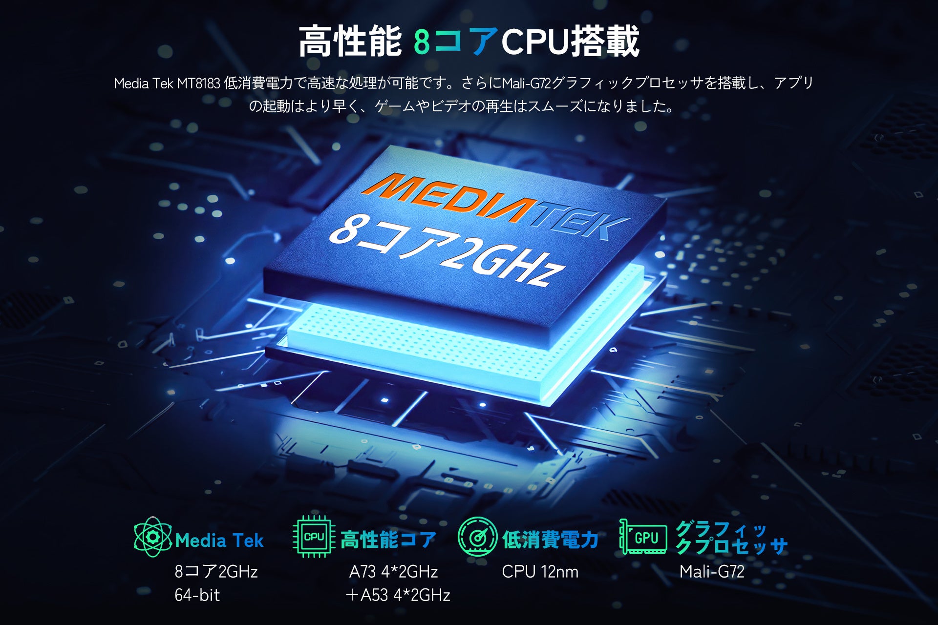 アンドロイドタブレットP30に採用されているMediaTek MT8183 CPUは、8コアで2.0GHzの高性能を誇り、処理速度が非常に速くなっています。また、A73 42GHz+A53 42GHzのCPU構成により、軽いタスクから重いタスクまで幅広い処理に対応することができます。 さらに、12nm低消費電力プロセス技術を採用することにより、バッテリーの消費量を抑えながら高速な処理を実現しています。また、Mali-G72グラフィックプロセッサを搭載しており、高解像度での映像再生やゲームプレイ、グラフィック関連のタスクにおいても、スムーズかつ高品質な処理が可能です。