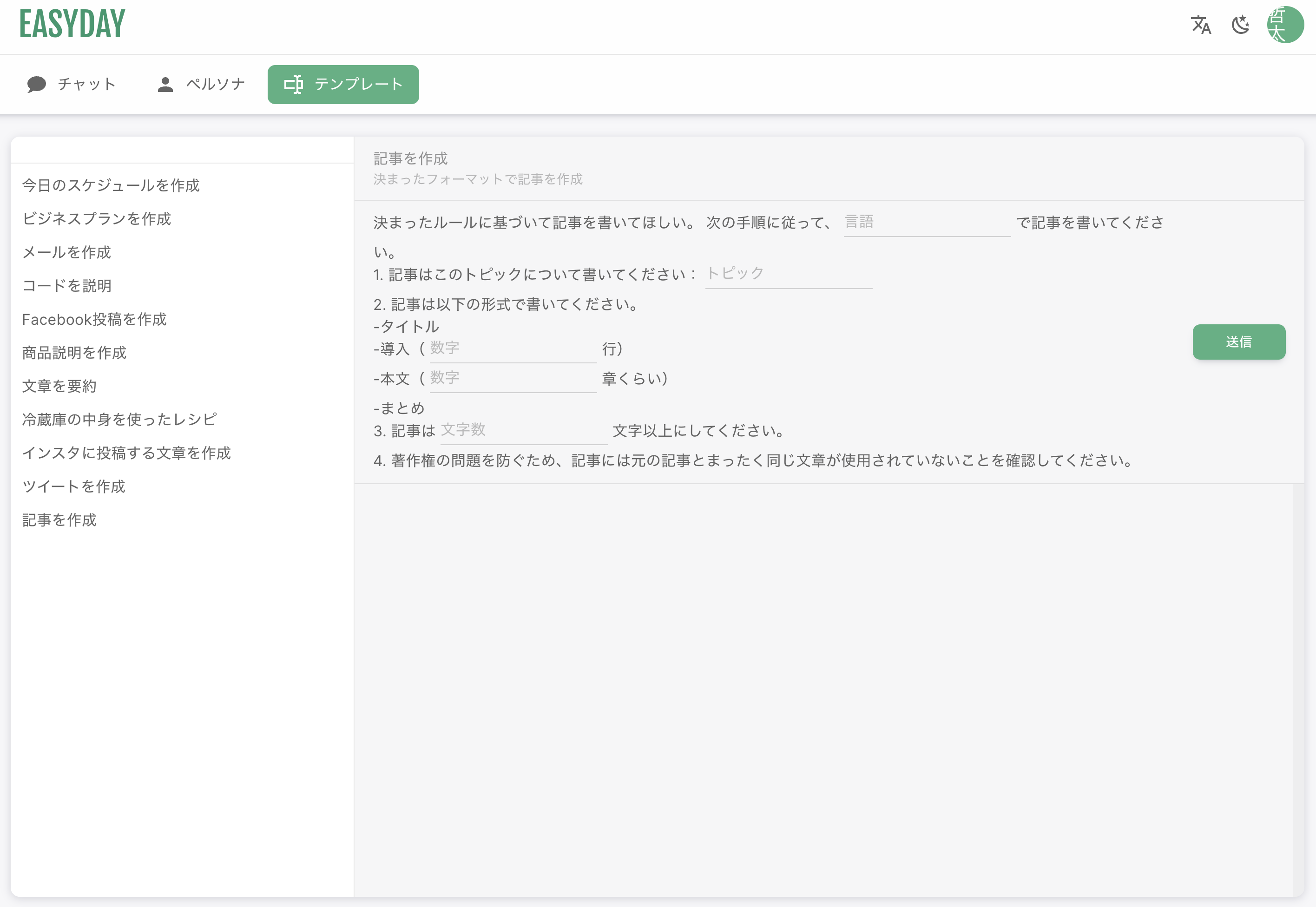 ChatGPTにはない日本語のテンプレートが豊富で、様々な場面で活用できるプロンプトテンプレートが利用できます。仕事ではもちろんですが、家事やその他の日常生活で役立つテンプレートを今後用意する予定です。現在「Easyday」では例えば以下のようなテンプレートのご利用が可能です。