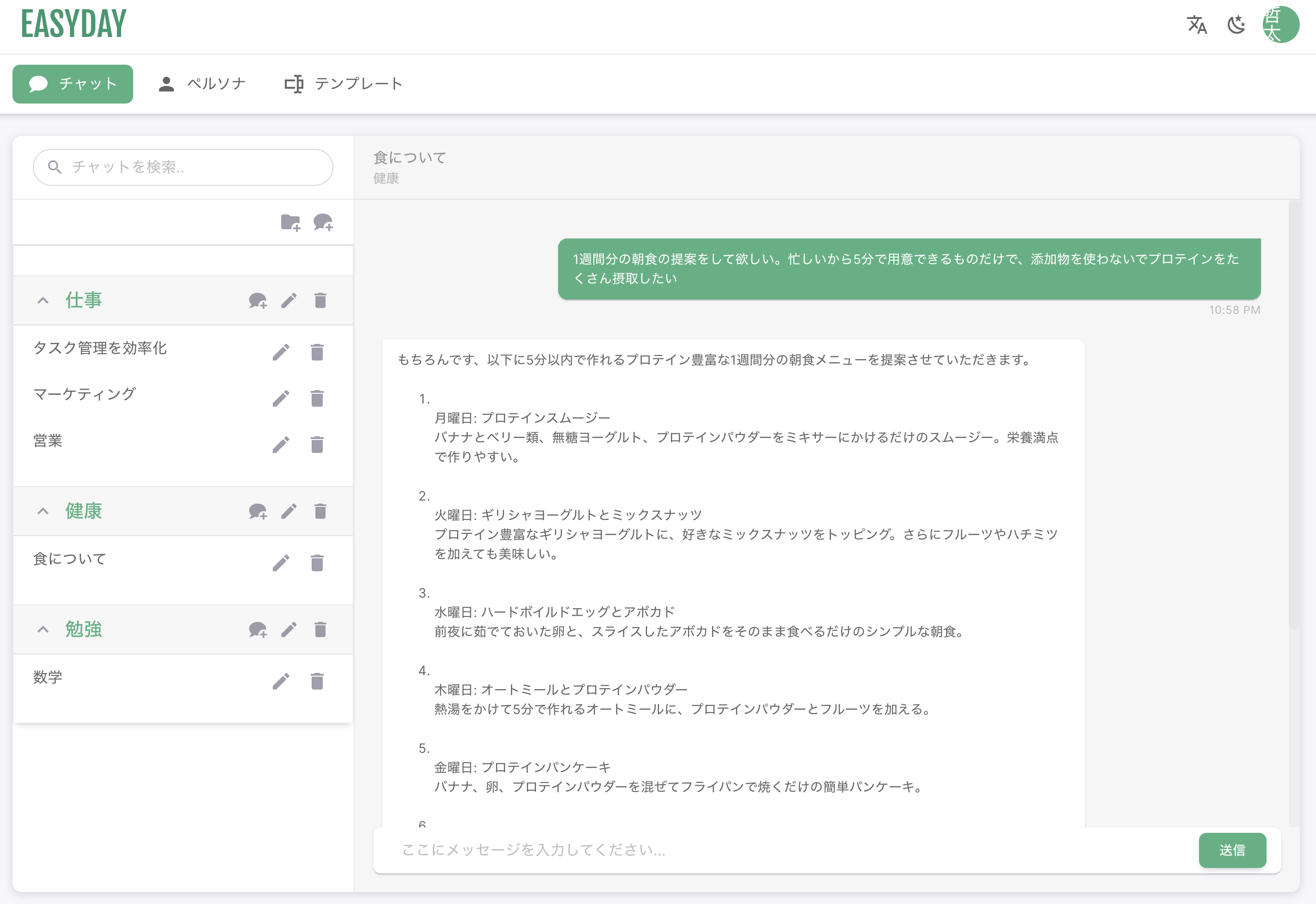 新しくリリースされたEasydayのサービスは、多様なシーンに対応するAIプロンプトとツールを提供します。7月20日のリリースでは「Easyday」の主要な3つの機能(チャット、ペルソナ、テンプレート)が利用できるようになっています。「Easyday」の直感的なデザインにより、誰でも簡単に操作が可能です。