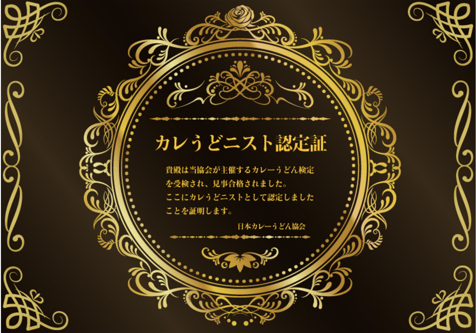 日本カレうどん協会の認定会員だけが与えられる、カレーうどんファンの称号です。協会では2023年3月から無料でカレーうどんに関する知識を判定するWEB上での筆記試験を実施しており、この試験に合格することで、真のカレーうどん好きの称号と、カレうどニストとしてふるまえるお墨付きを手にできます。年齢、性別、学歴を問わないマニアの証は、今や国民食ともされるカレーうどんの普及活動にも大きく寄与するもので、既にカレーうどん界隈では隠れた名誉職とも認知され、カレーうどん好きな方には必携の資格です。